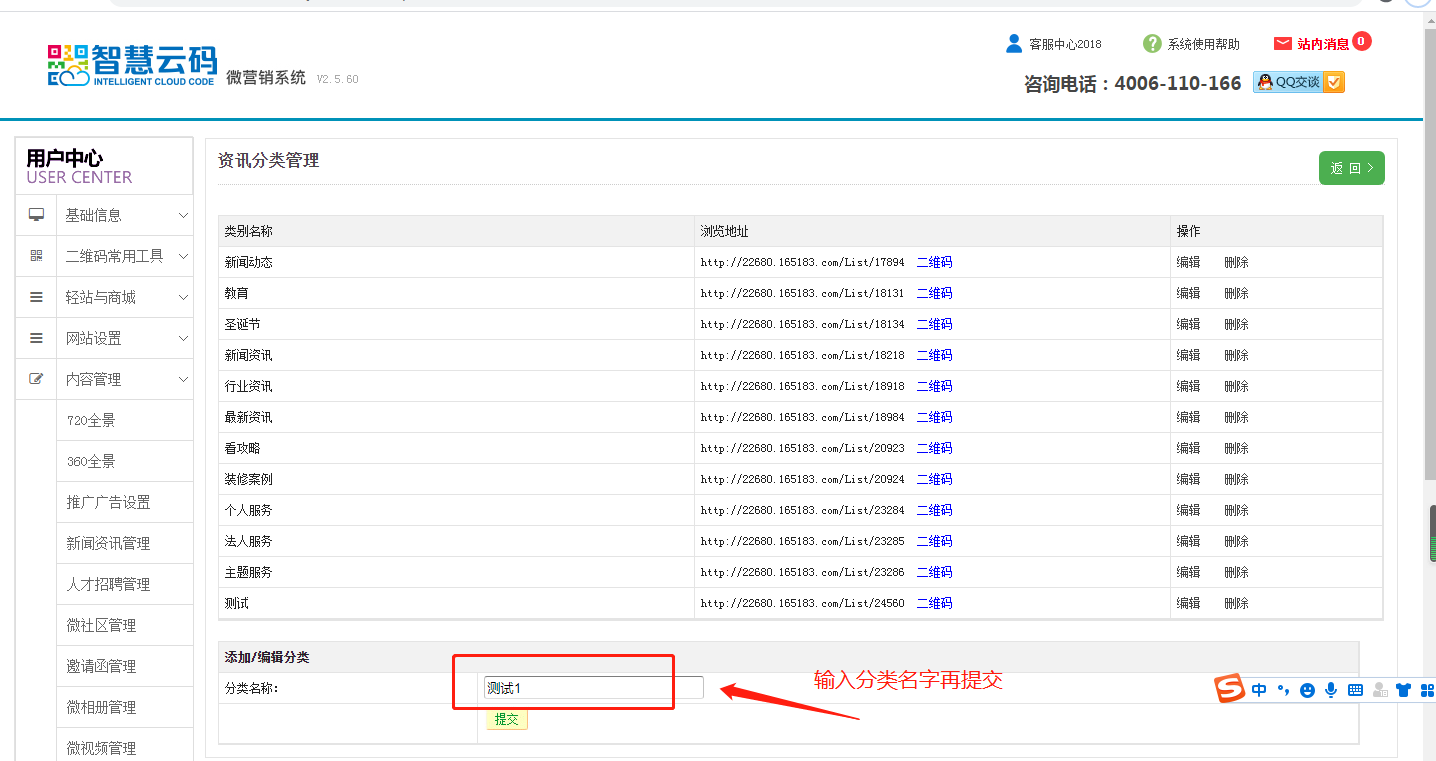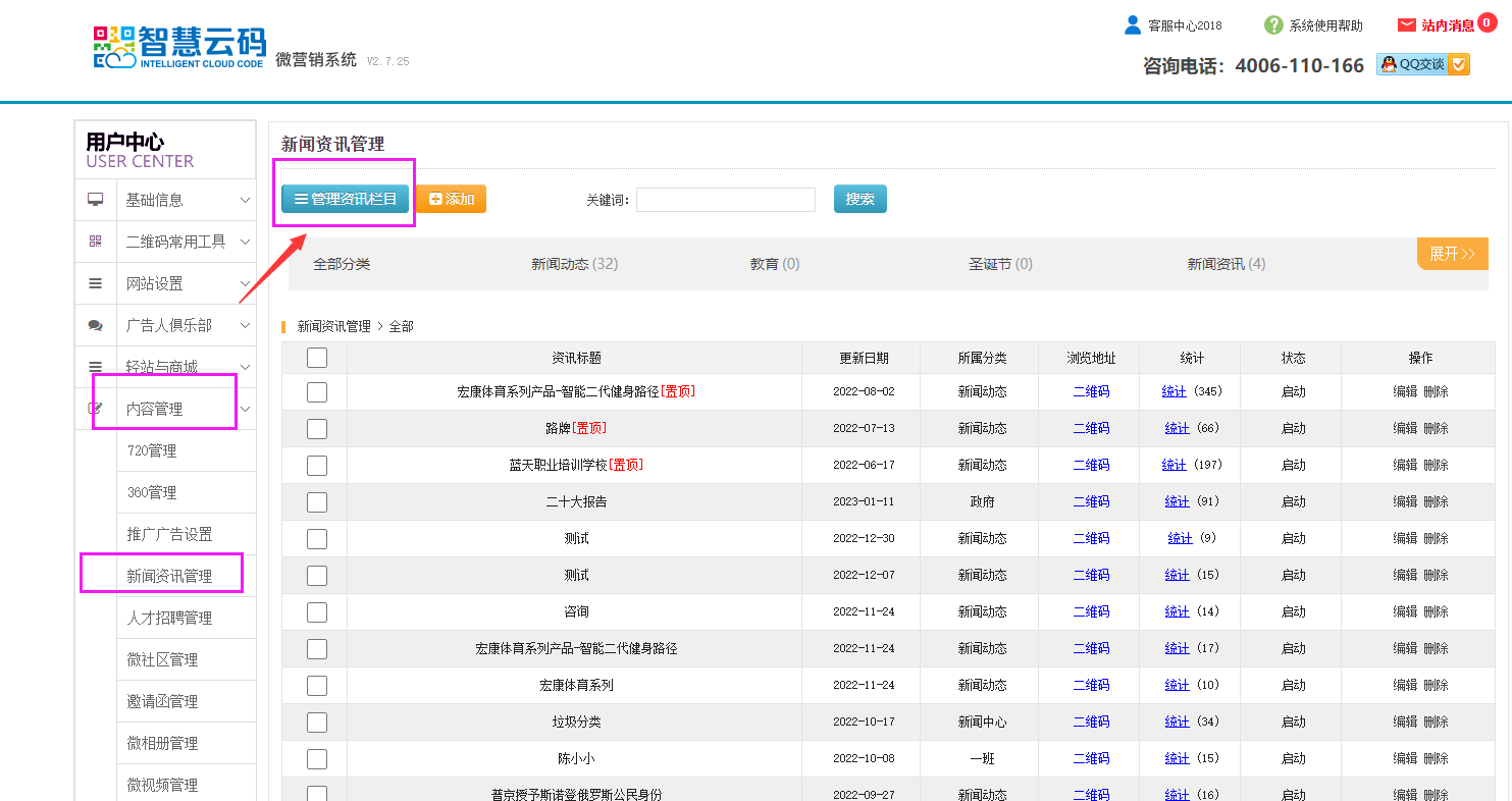 1、首先登陸智慧云碼系統,找到內容管理,點開新聞資訊管理,點擊管理資訊欄目,先設置分類,如下圖所示