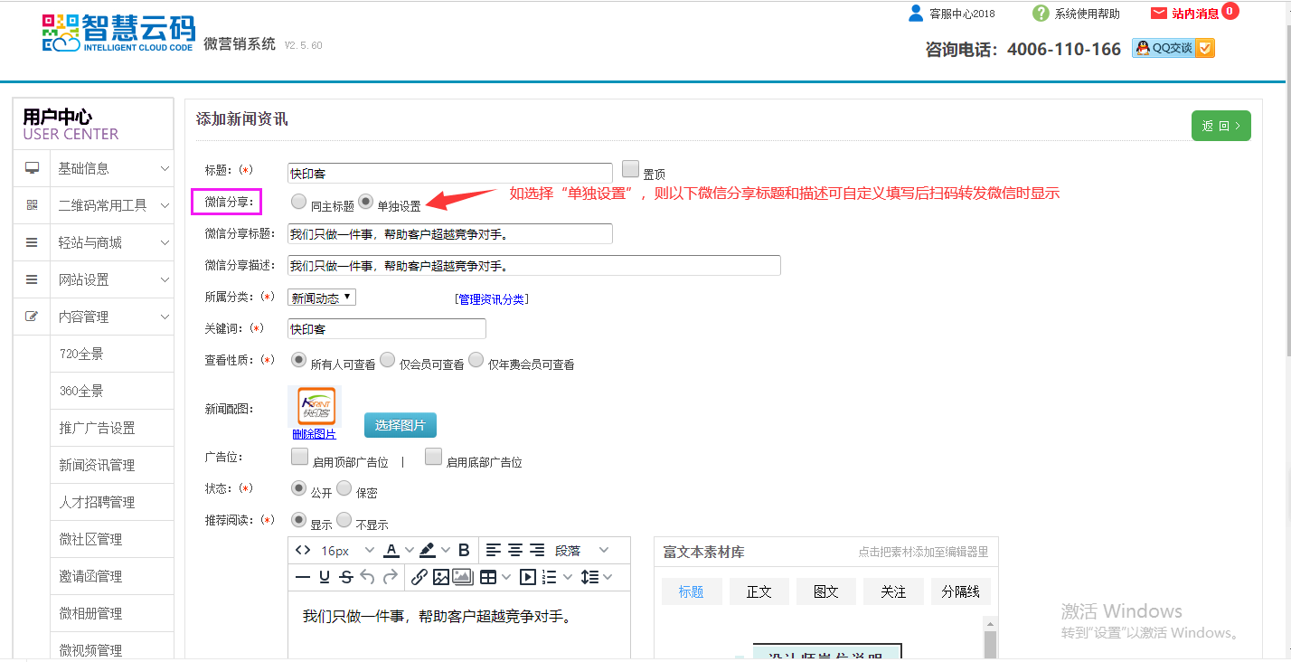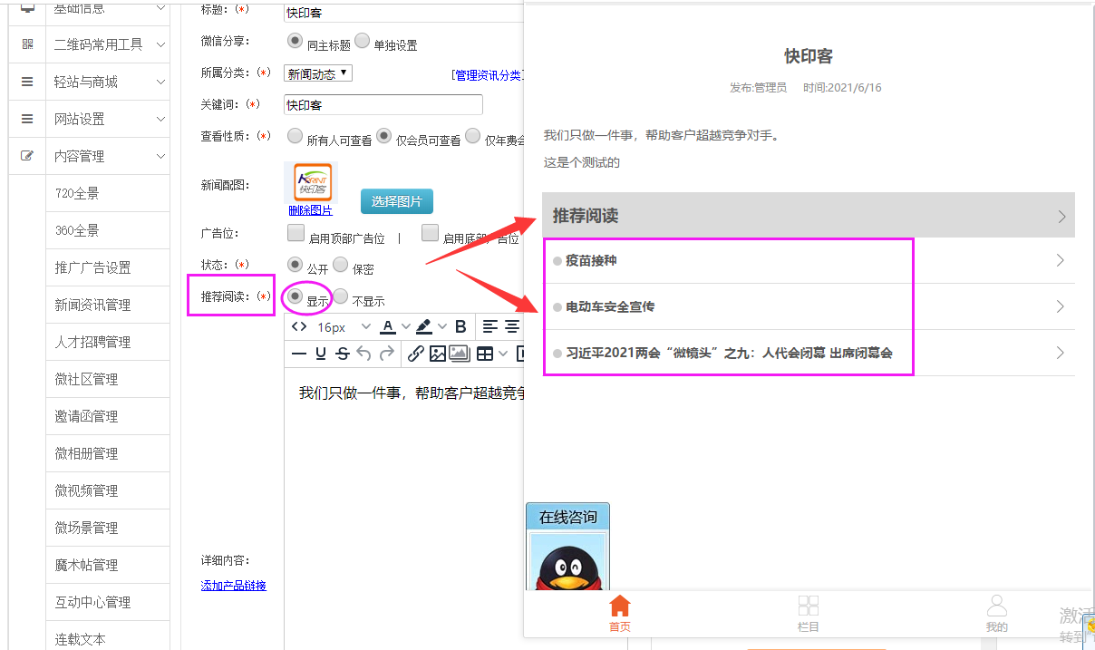 (注意事項:新聞資訊都會附帶微官網欄目,依托于微官網商城呈現來顯示的)