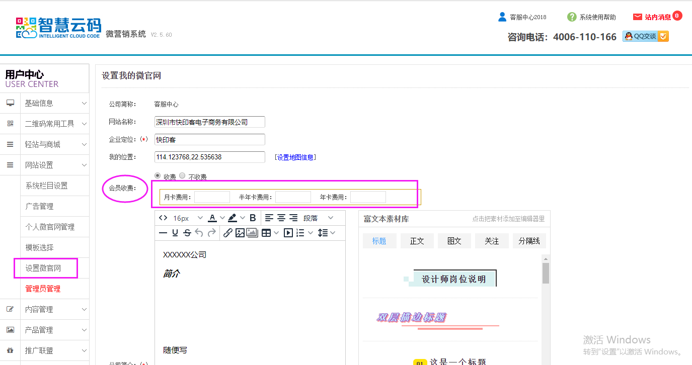 查看性質可以選擇所有人可查看、僅會員可查看或僅年費會員可查看(如選擇后2種則需自行先去網站設置里找到“設置微官網”先對應設置好會員收費標準)如下圖所示: