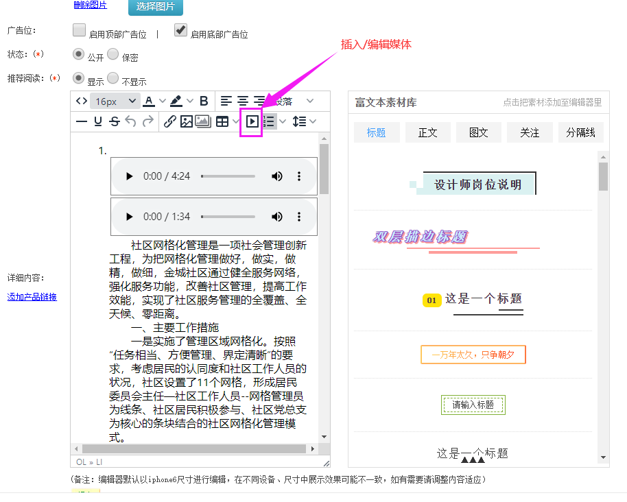 新聞配圖可上傳也可不上傳,無尺寸要求,格式為JPG/PNG;廣告位按實際需求決定是否打勾啟用;狀態選擇公開或保密;