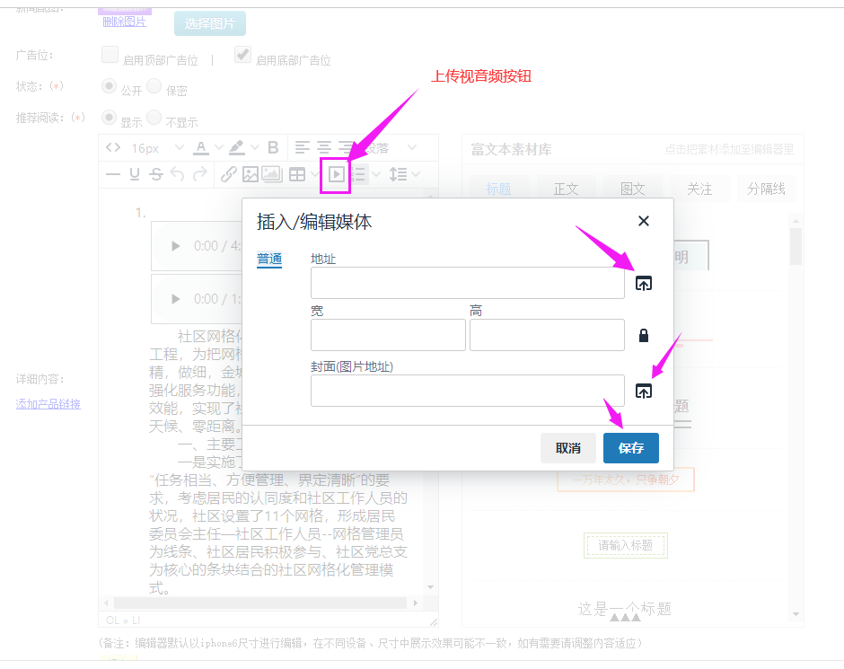 按自身需求完善后保存即可(視頻建議不超過20M/格式是MP4)。視頻音頻都是同樣上傳方法。
