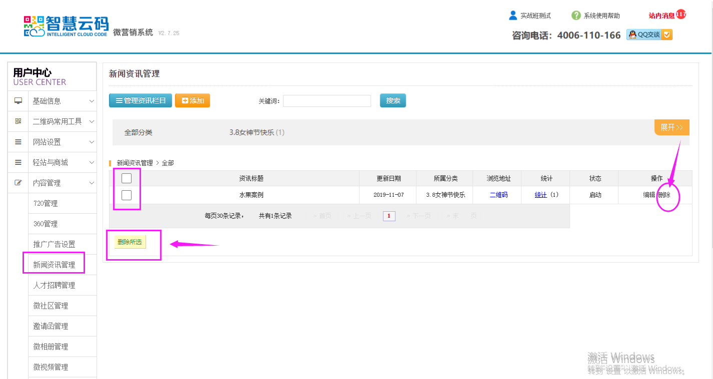 3、如已添加好的新聞資訊記錄,需要進行刪除,可找到對應記錄進行勾選后刪除所選(正常來說無需無必要進行刪除系統對應記錄,之后二次多次修改均可)或是操作下面進行刪除,如下圖所示: