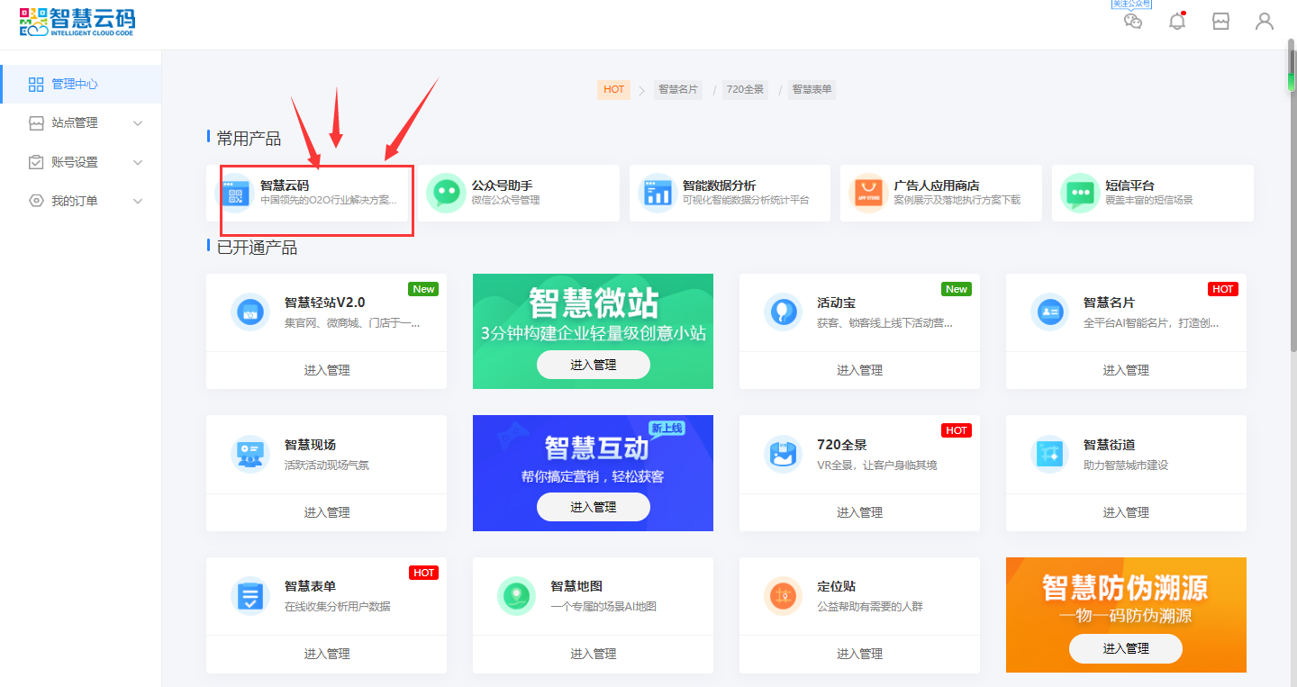 需注意的是: 加盟店系統開通后,當前智慧云碼系統賬號為企業品牌微官網,默認標配含有2個個人微官網名額。