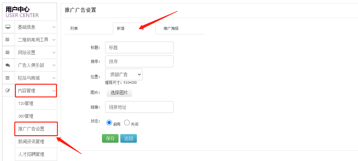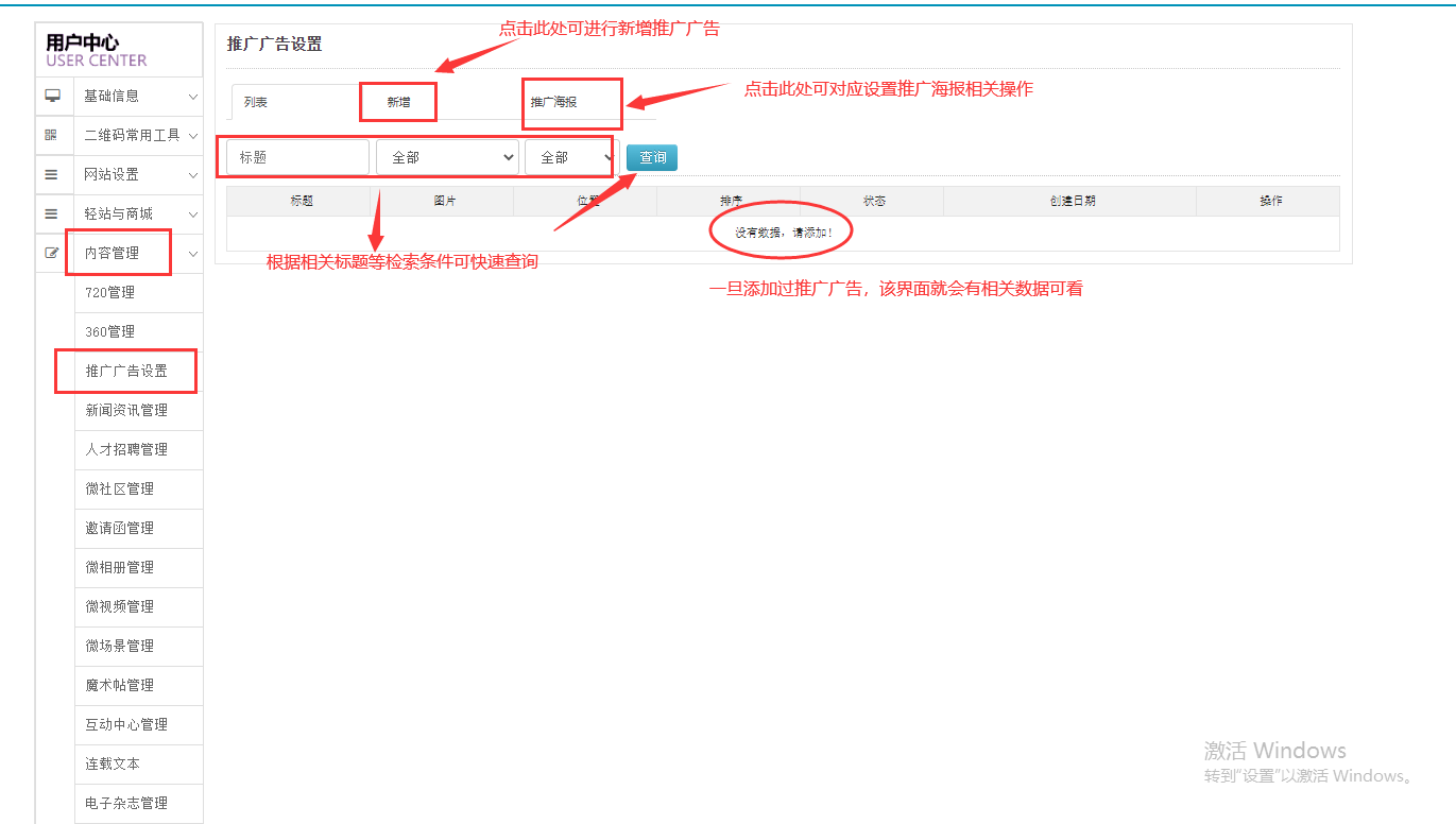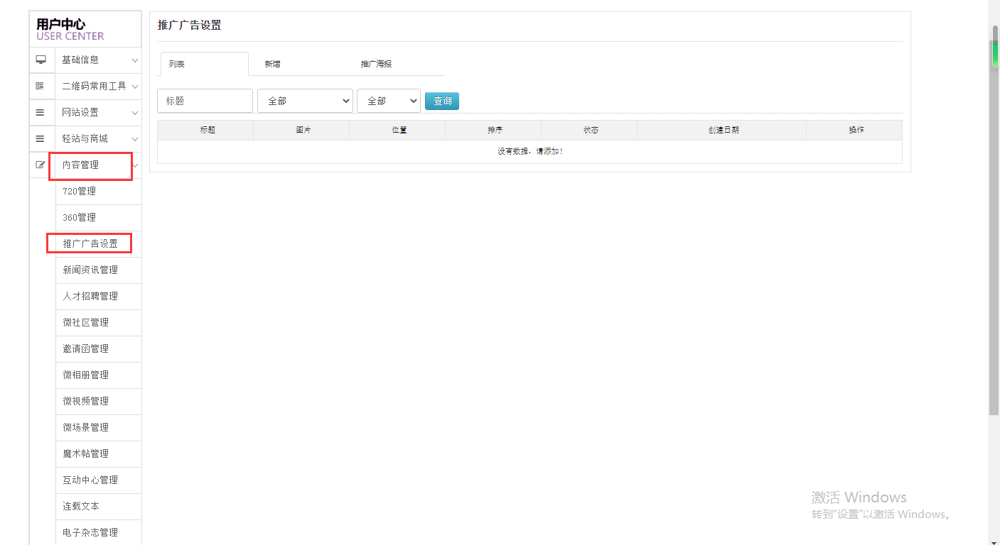 1、點擊內容管理,找到推廣廣告設置,點擊新增。如下圖所示: