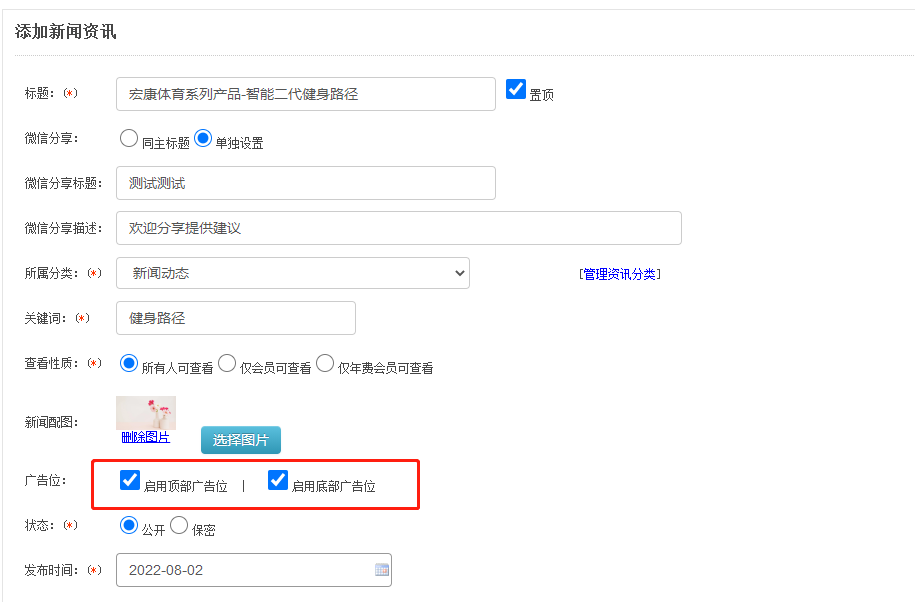 標題和排序按實際情況填寫即可;位置處可以選擇頂部廣告/底部廣告,頂部廣告只允許設置一張廣告圖片, 底部廣告可以設置多張;如果當前選擇的是頂部廣告,那么需要上傳510*200px的圖片;
