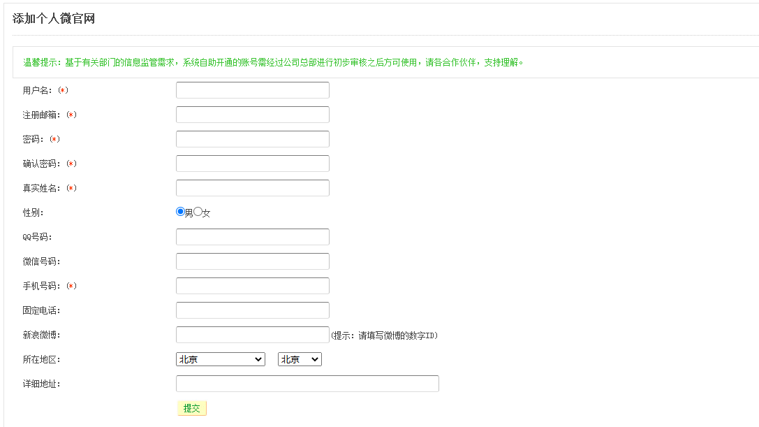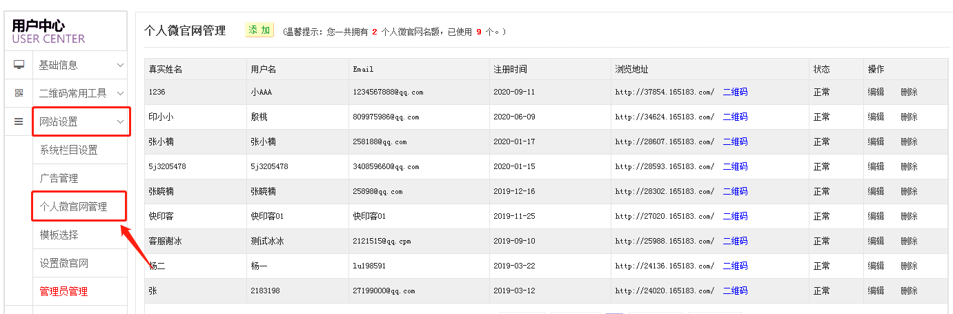 1.1、打開微官網設置欄目,點擊個人微官網管理,點擊添加,按照自身實際情況填寫完畢即可。具體添加步驟如下圖所示: