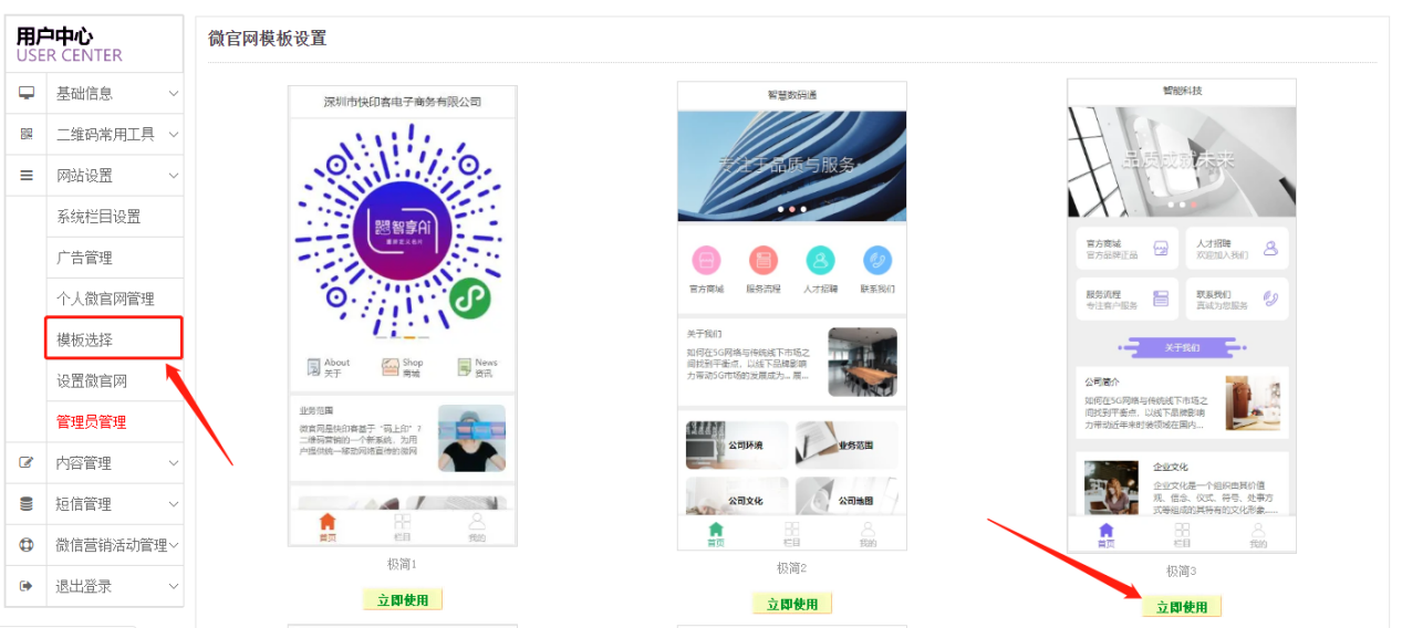 網站設置-找到模板選擇,系統開通后自帶有默認風格模板,可根據自身宣傳推廣所需對應選擇后按立即使用即可,進入商城首頁后即是所選風格模板的顯示形式!(注:每款風格模板均有自身對應顯示功能效果并需相應設置一些板塊,詳情請對應使用風格模板后細看灰色字體相關提示)