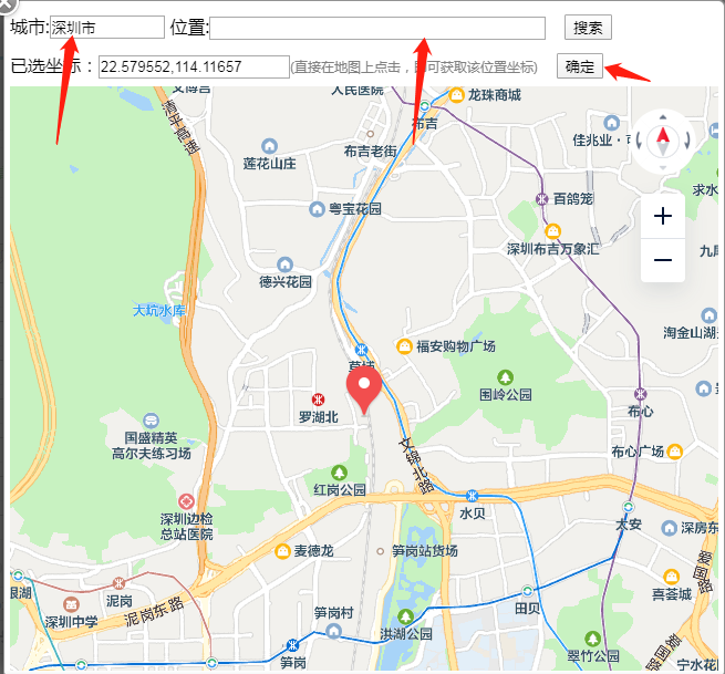 1.1.1、我的位置需要點擊“設置地圖信息”,在彈出的頁面,先輸入當前所在城市,正確輸入位置地址后,使用鼠標獲取精準位置后,點擊確定。如下圖所示: