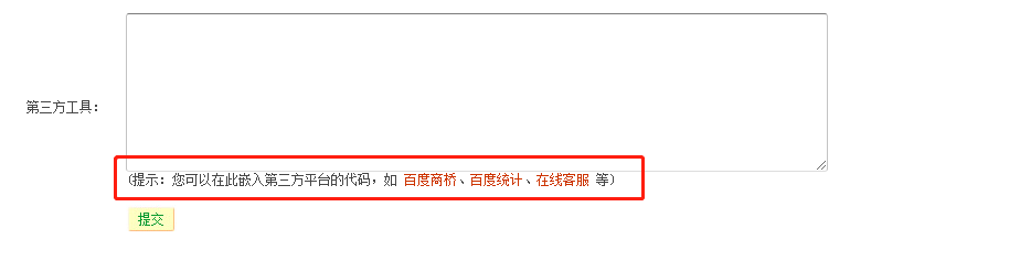 第三方工具:可以在此處嵌入第三方平臺的代碼,如 百度商橋、百度統計、在線客服 等,如沒有相關代碼或不懂代碼等,則可忽略不填即可。一般正常情況都無需填寫!如下圖所示: