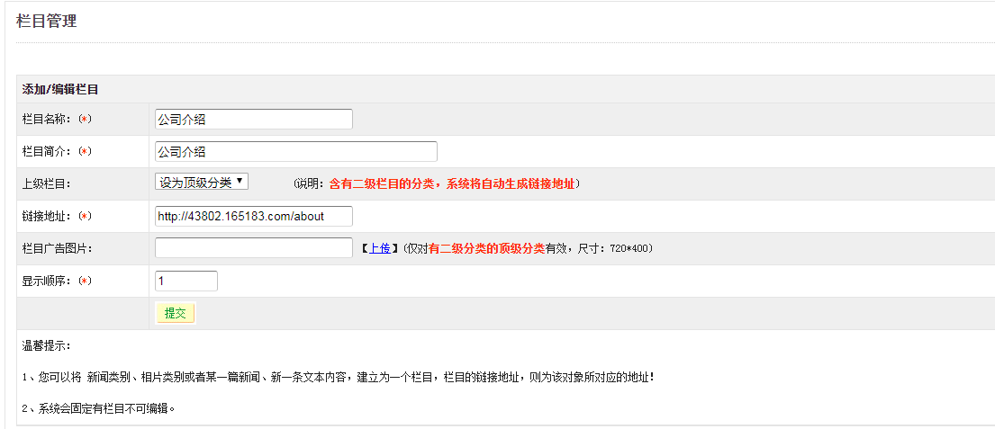 上級欄目:如有分多級欄目,可對應設置為頂級分類或是頂級分類下的二級欄目下面,需注意,針對有二級欄目的分類,系統將會自動生成頂級分類的鏈接地址;
