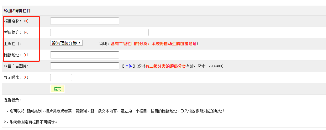 第二種情況:自定義添加/編輯新欄目內容(注:但凡帶星號均是必填項)