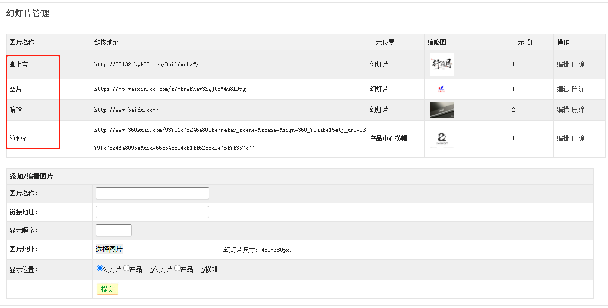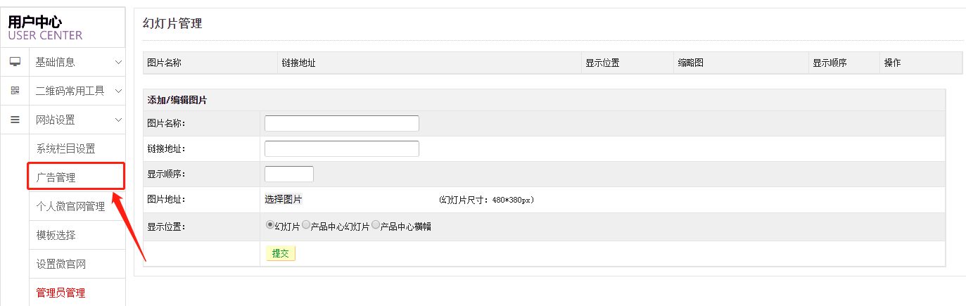 1、網站設置-廣告管理,點擊進去,點添加/編輯圖片頁面進行對應填寫完善即可;