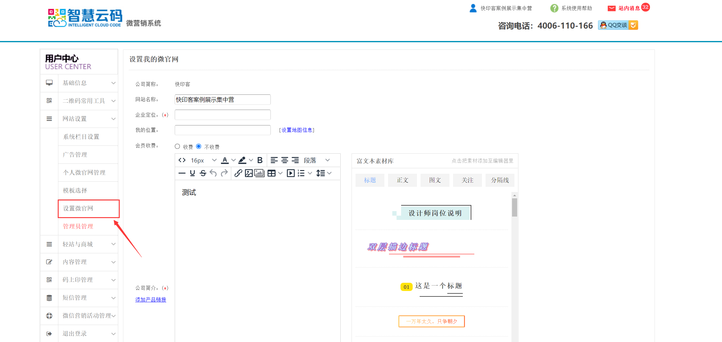 1、點開設置微官網,按實際情況填寫信息,網站名稱默認按注冊的賬號顯示、企業定位按照實際情況填寫即可;會員收費建議直接選擇不收費。操作步驟如下圖所示: