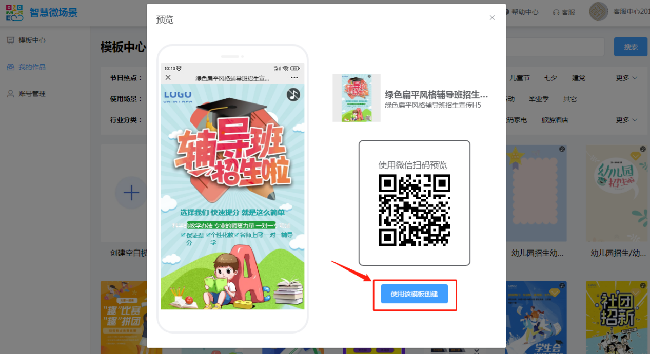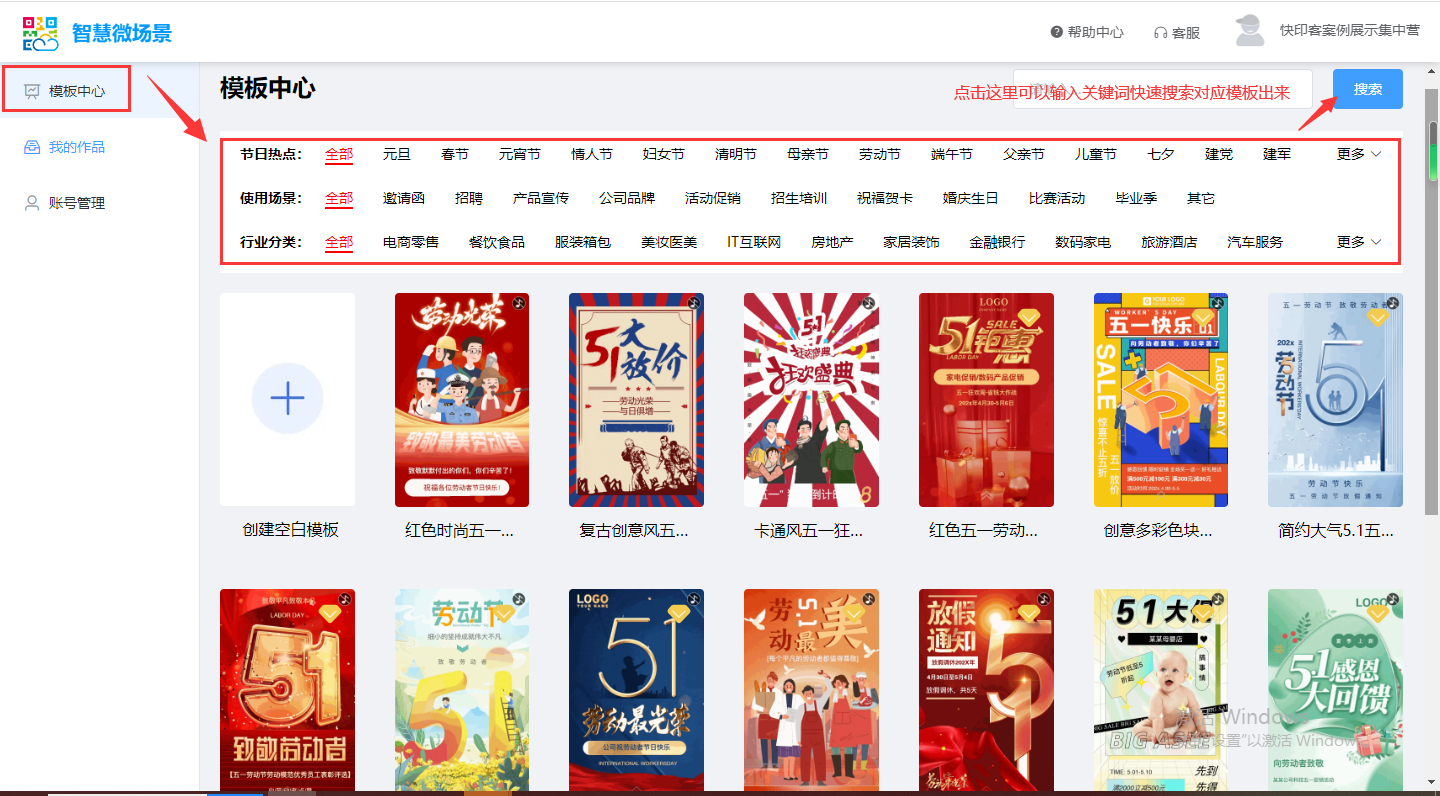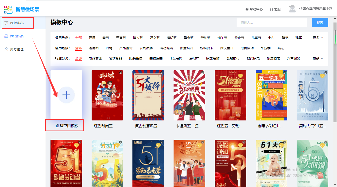 2、在智慧微場景管理頁面,點擊模板中心,選擇或搜索自己想要的模板類型,創建一個新的模板。也可以在右上角搜索模板,找到適合的模板。或者創建一個空白的模板,自己設計也可以。如下圖所示:
