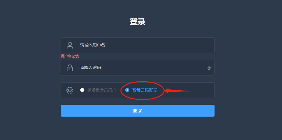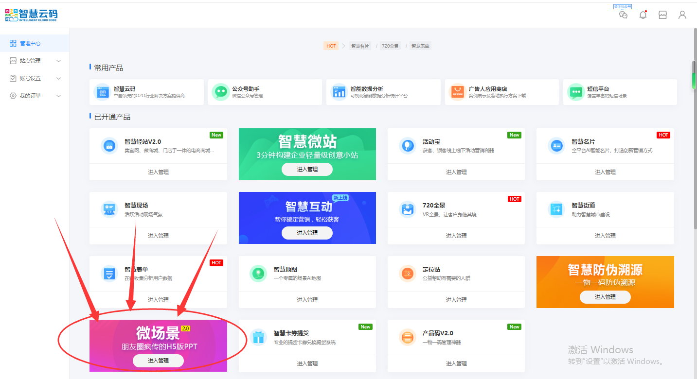1、首先登陸智慧云碼,找到已開通產品,點擊微場景2.0進入管理界面,或通過登錄網址:https://ms.kyk251.cn/#/account-login?redirect=%2Fcreation,輸入你的智慧云碼賬號密碼,選擇智慧云碼賬號登錄即可。如下圖所示: