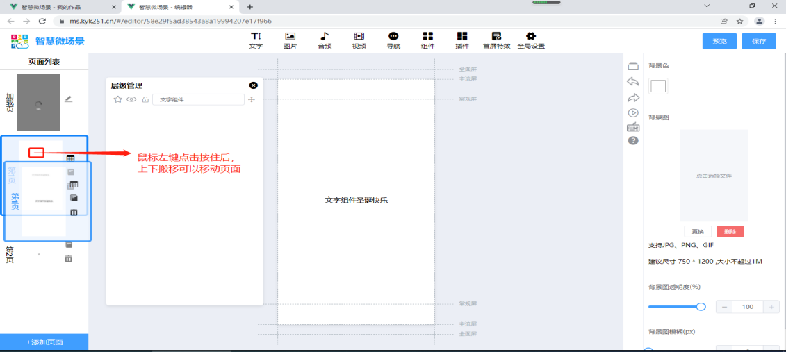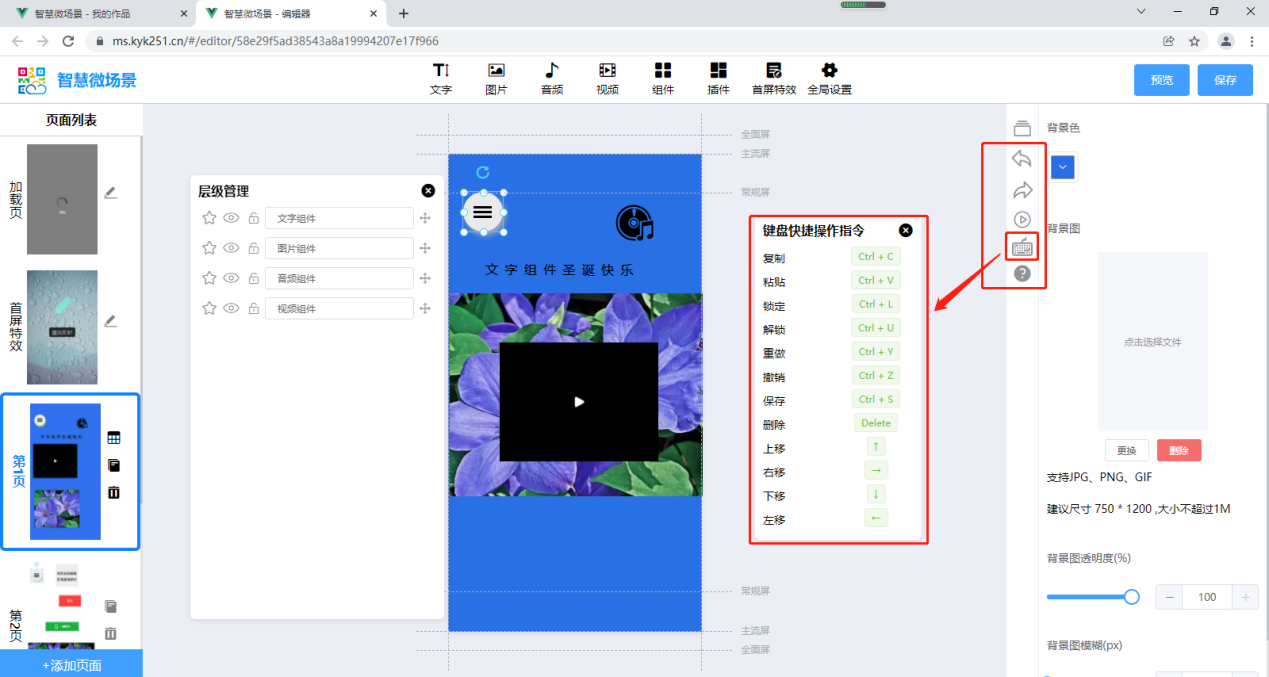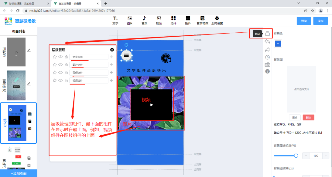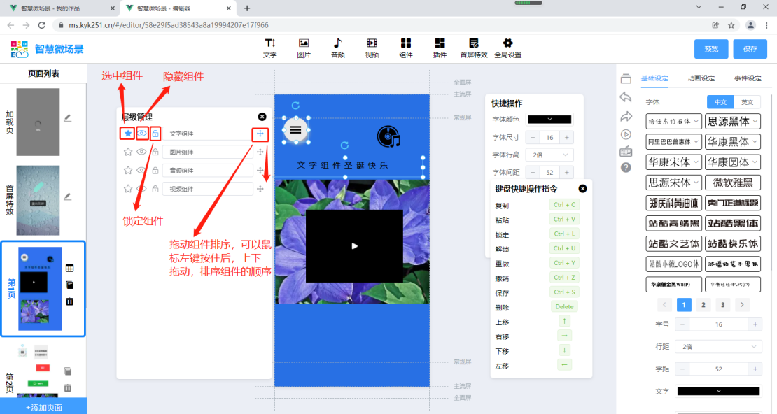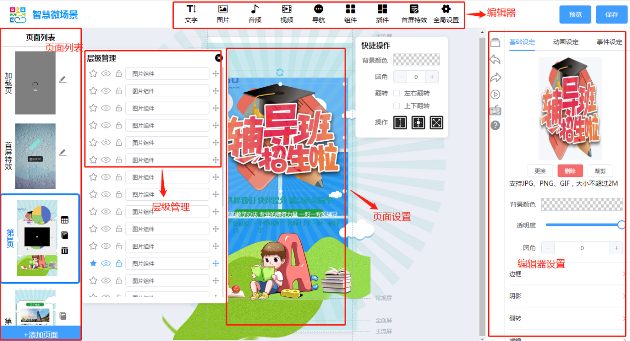 3、我的作品編輯功能主要分為:頁面列表、編輯器、層級管理。如下圖所示: