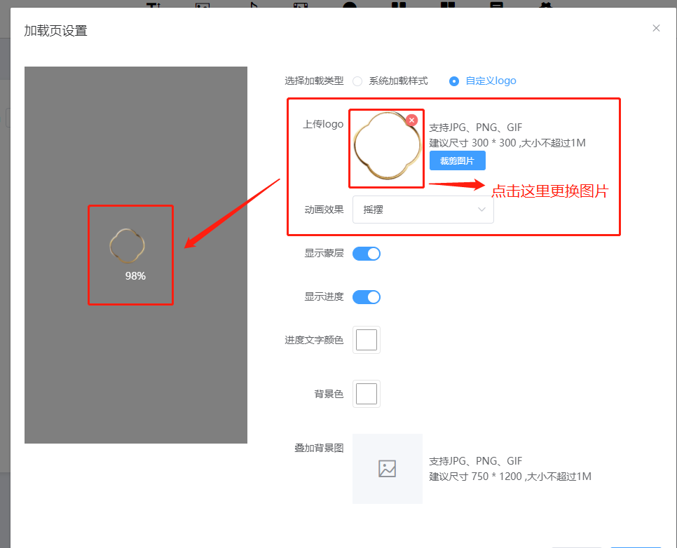 同理,設置加載頁的疊加背景圖,也是同樣的操作,點擊背景圖標可以選擇背景圖或者上傳圖片。編輯完成后,點擊【確定】按鈕保存即可。如下圖所示: