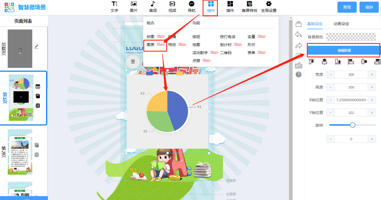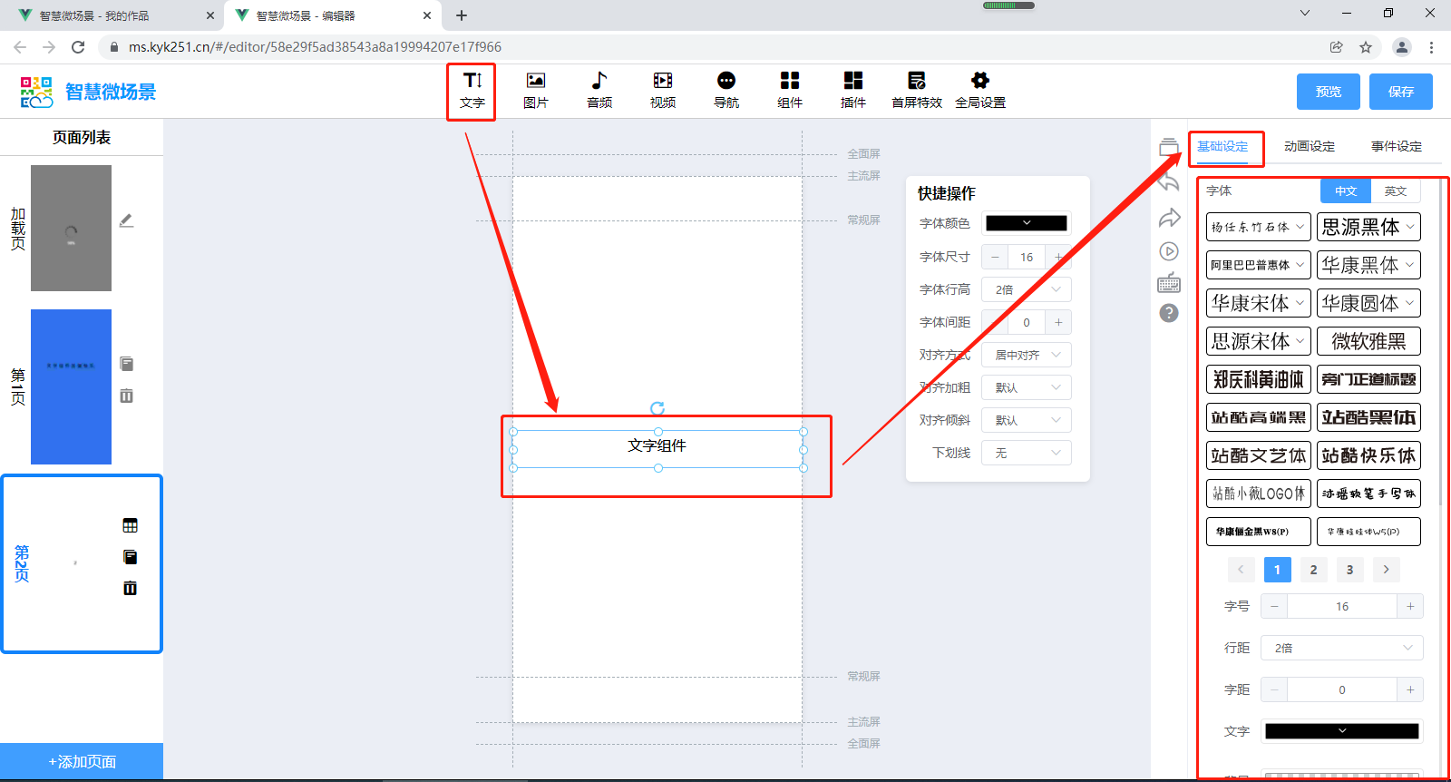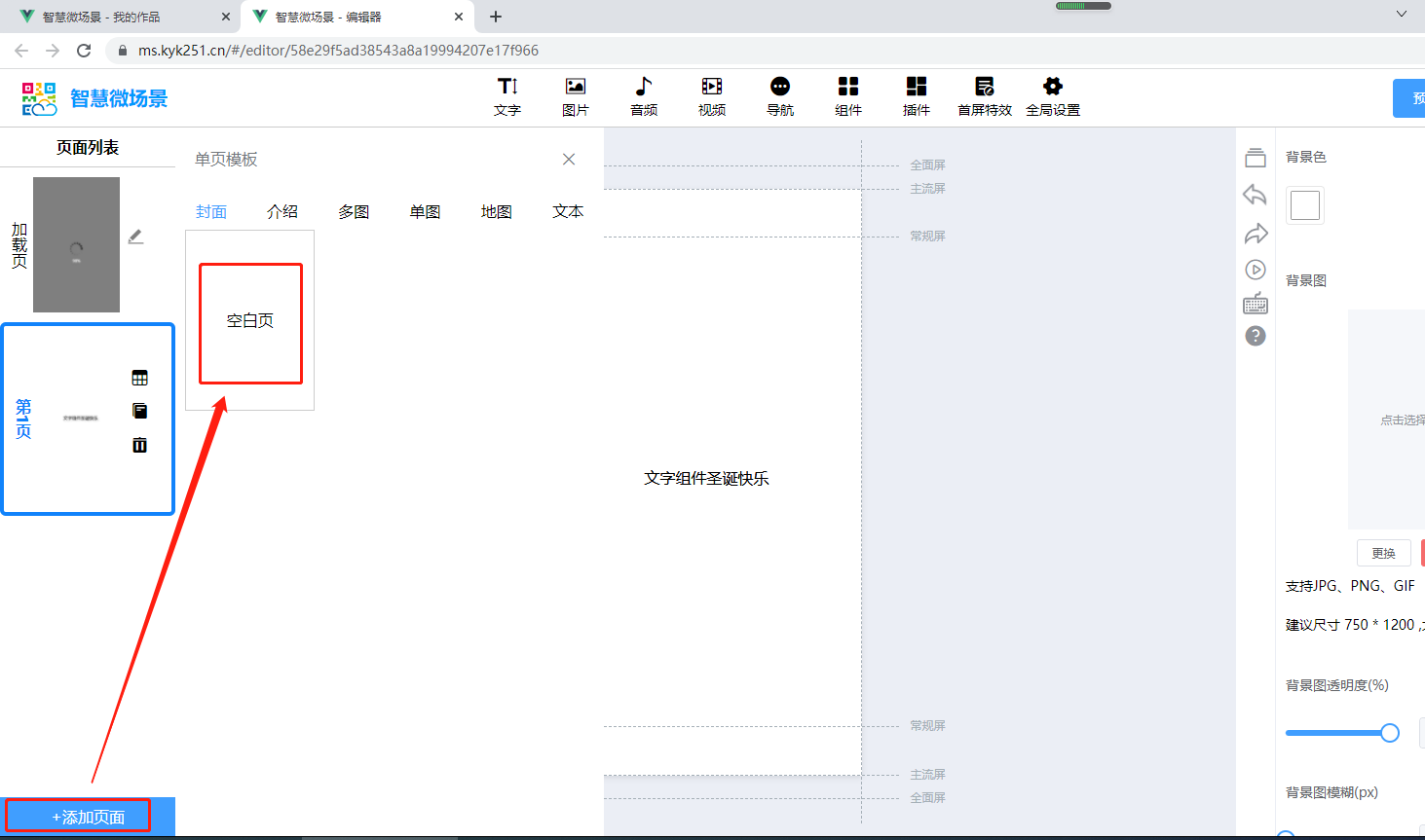 點擊編輯器左下角的“+添加頁面”,再次點擊空白頁,可以增加一頁新頁面。如下圖所示: