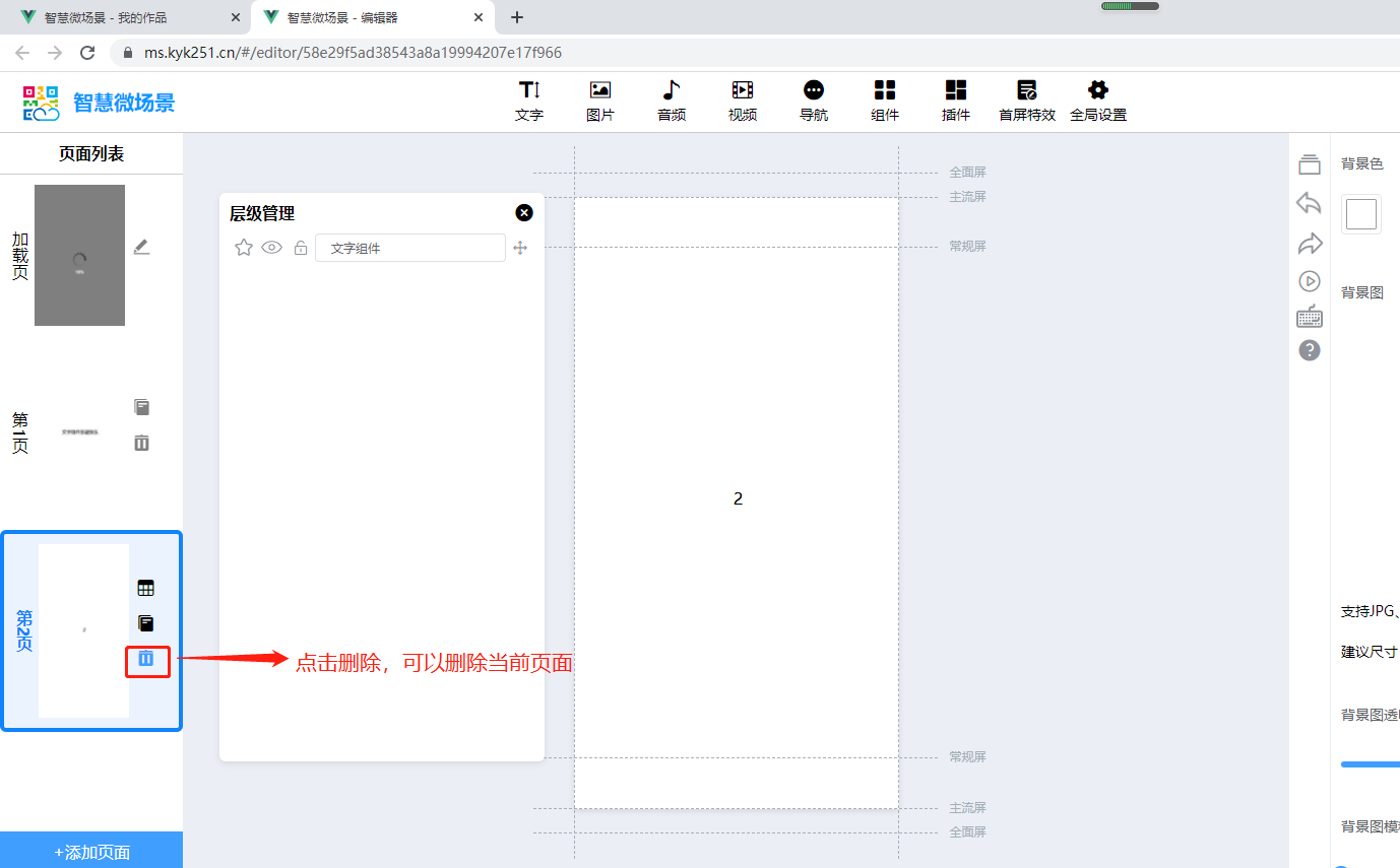 選擇某一頁面后,點擊刪除功能,可以刪除當前頁面。建議謹慎操作,刪除后不可恢復。如下圖所示: