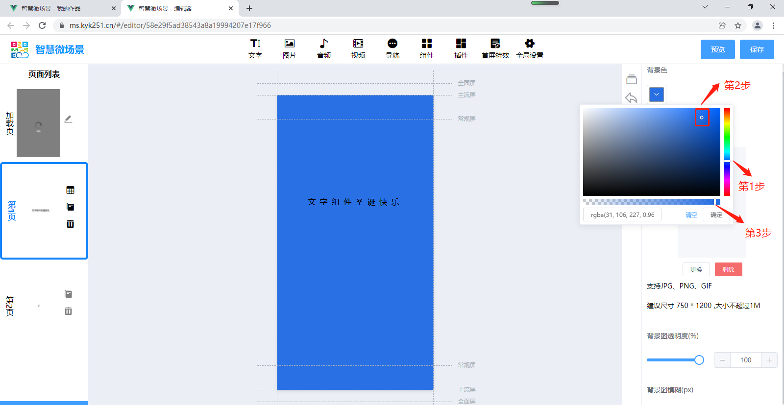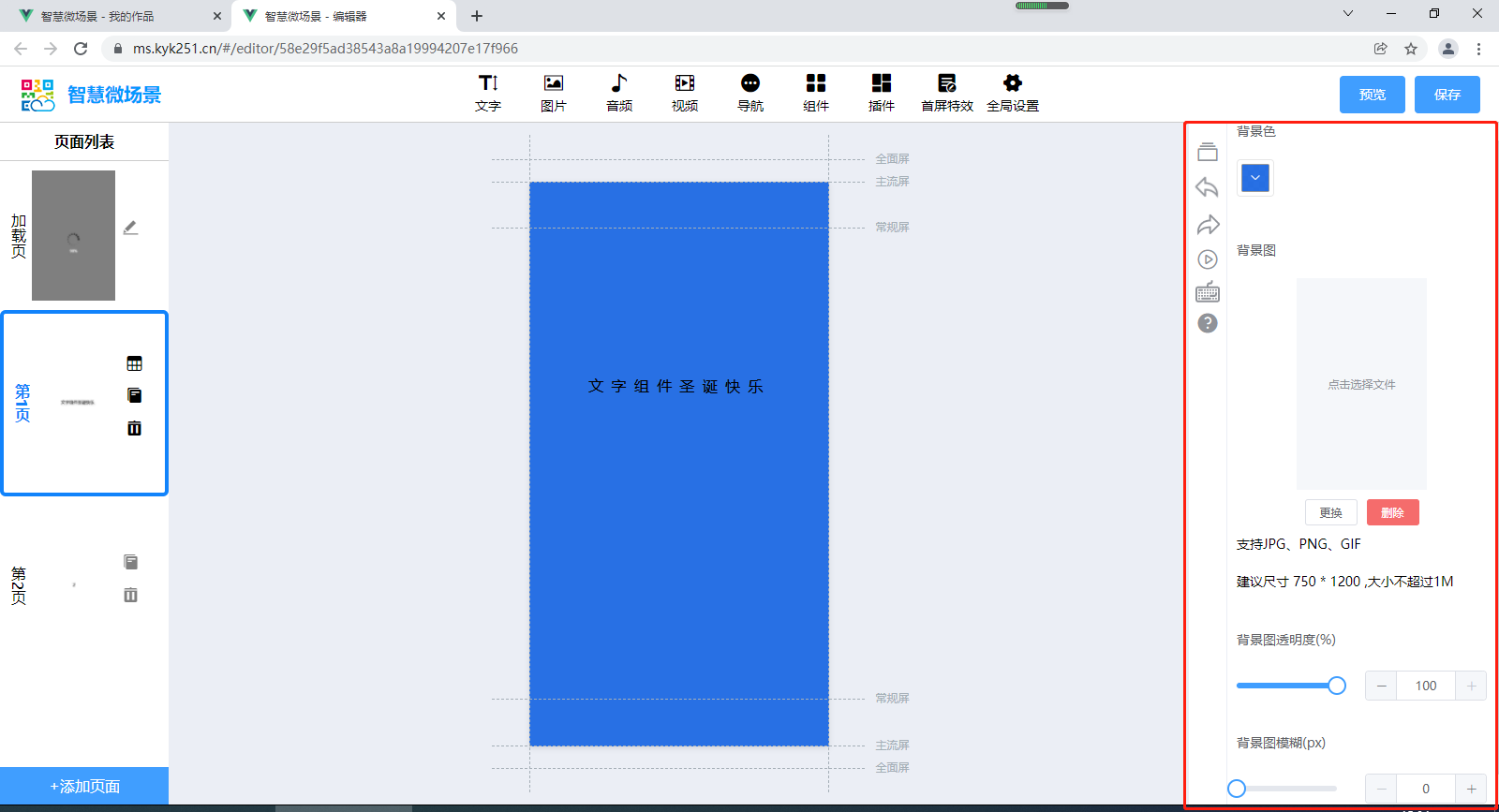 背景圖:設置整個頁面的背景圖,有背景圖時,背景色會被背景圖覆蓋。背景圖是以拉伸的方式顯示在頁面上,建議尺寸750*1200,大小不超過1M,否則背景圖顯示會扭曲。
