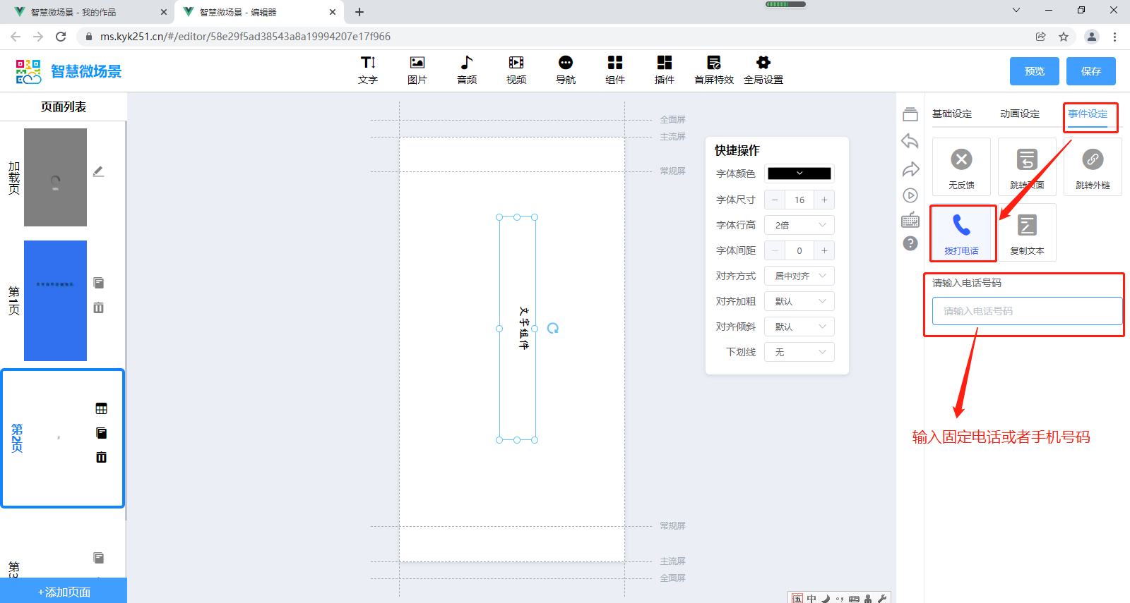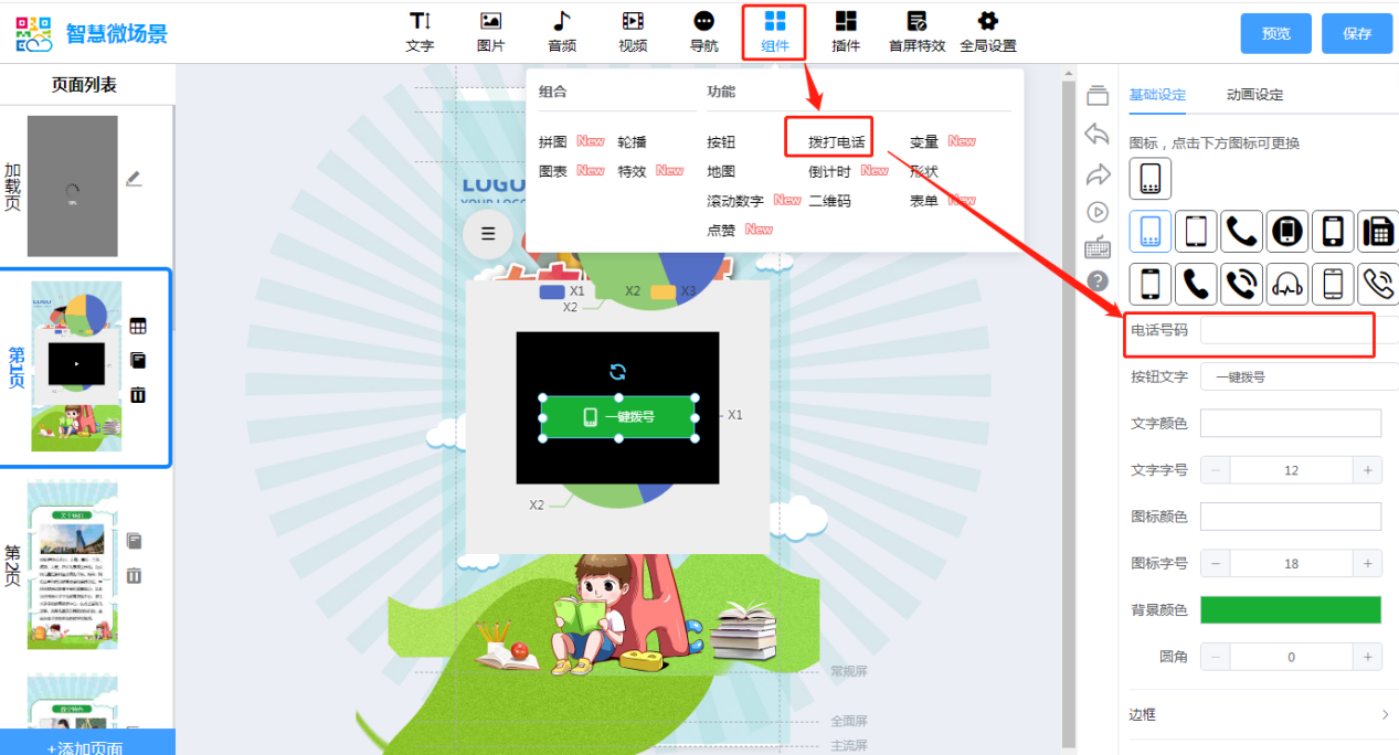 ⑥撥打電話組件,選擇“撥打電話”在頁面上增加一個撥打電話組件,點擊后可以撥打電話