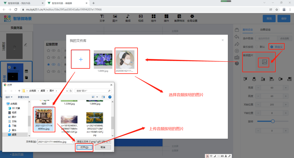 上傳或者更換音頻:點擊音頻,基礎設定,點擊選取