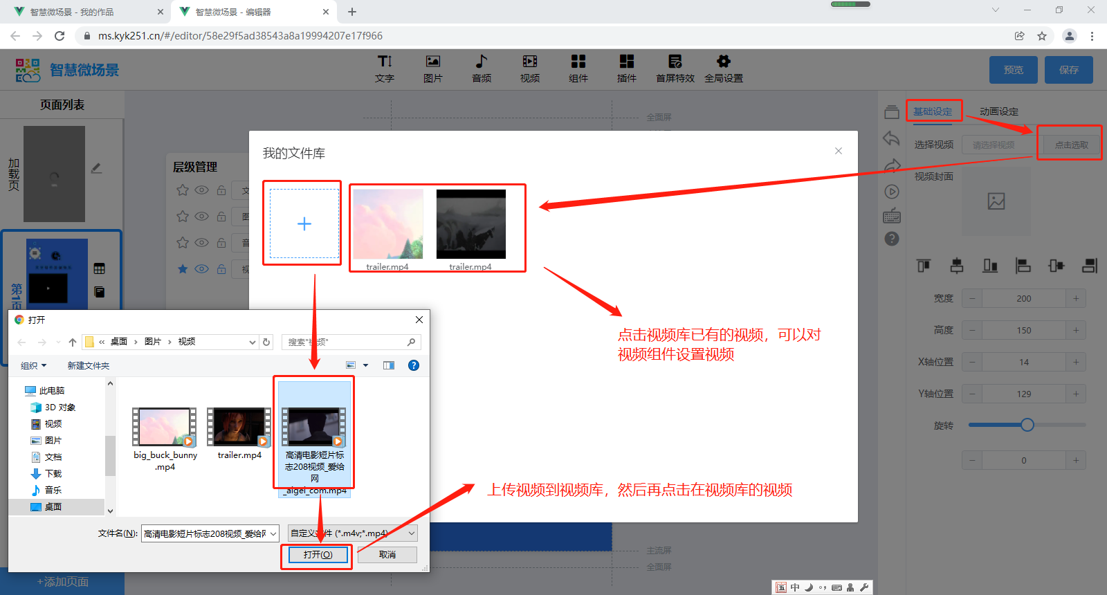 上傳或者更換視頻:點擊視頻組件,基礎設定,點擊選取。默認情況下,會自己截取視頻某一個畫面,作為視頻封面。如下圖所示: