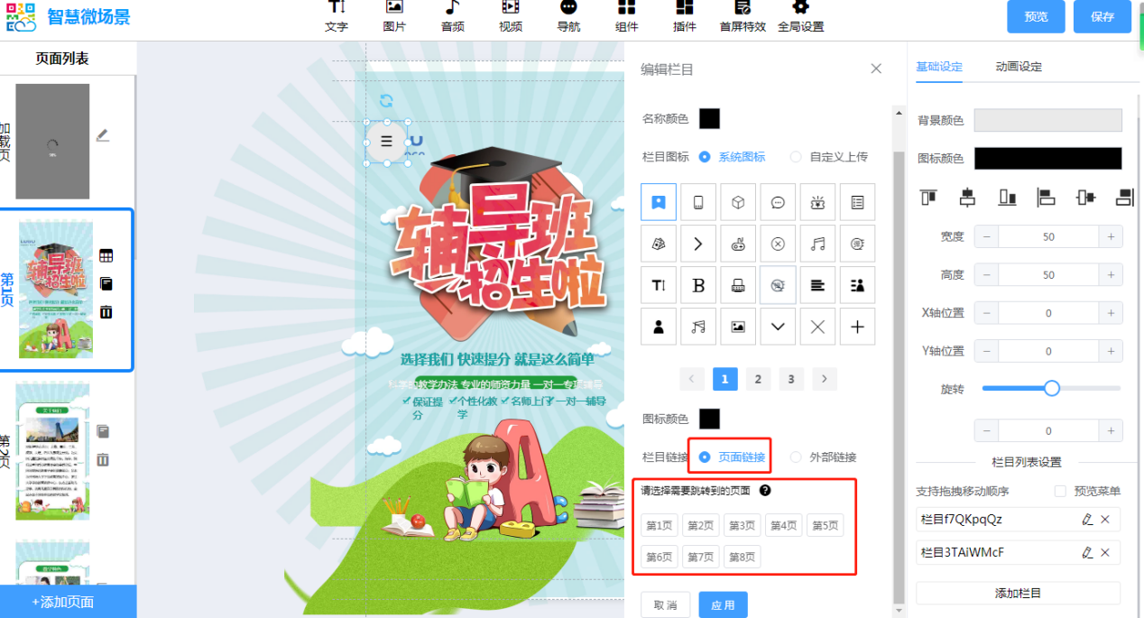 可新增多個欄目,作用為導航導視欄目(針對全頁面展示),修改欄目名稱后,可對應修改設置的跳轉鏈接。如下圖所示: