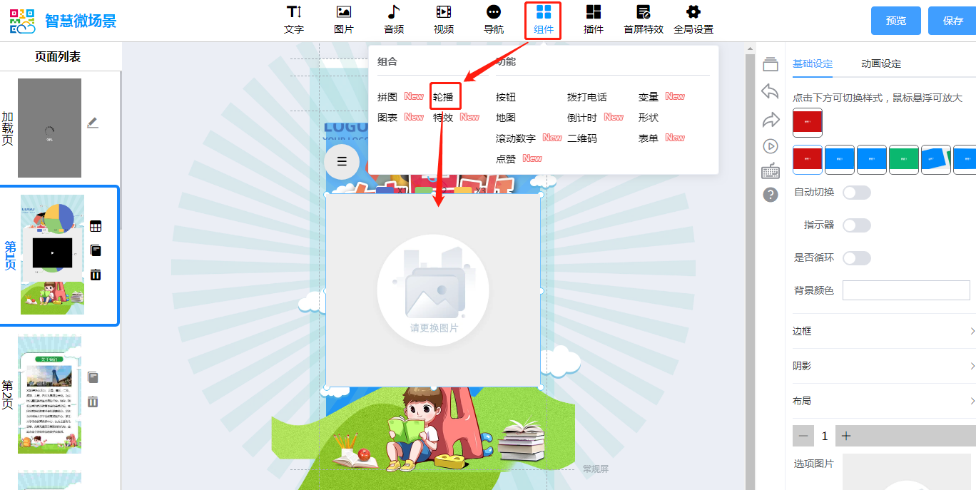 ②輪播,在頁面上增加一個輪播組件,可以對圖片進行輪播的效果,可根據需求切換樣式