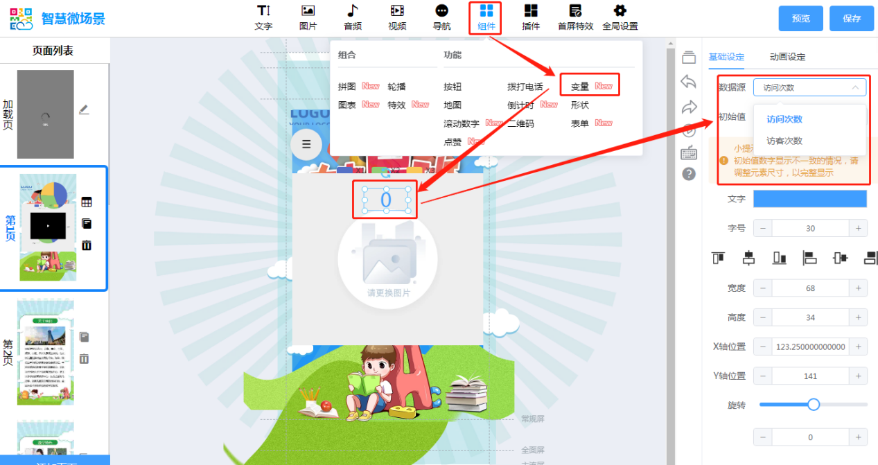 ⑦變量組件,數據源分為兩種,一個是訪問次數,一個是訪客次數。訪問次數是指按進入次數來計算,無論是否為同一用戶,只要進入瀏覽都算作一次,同一用戶多次進入算多次;而訪客次數是按人頭來統計數據,同一用戶就算反復進入,都只算一次數據。如下圖所示: