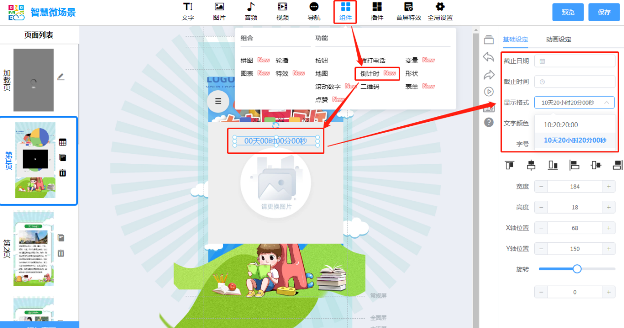 ⑨倒計時組件,在右側設置截止日期與時間,以倒計時形式呈現