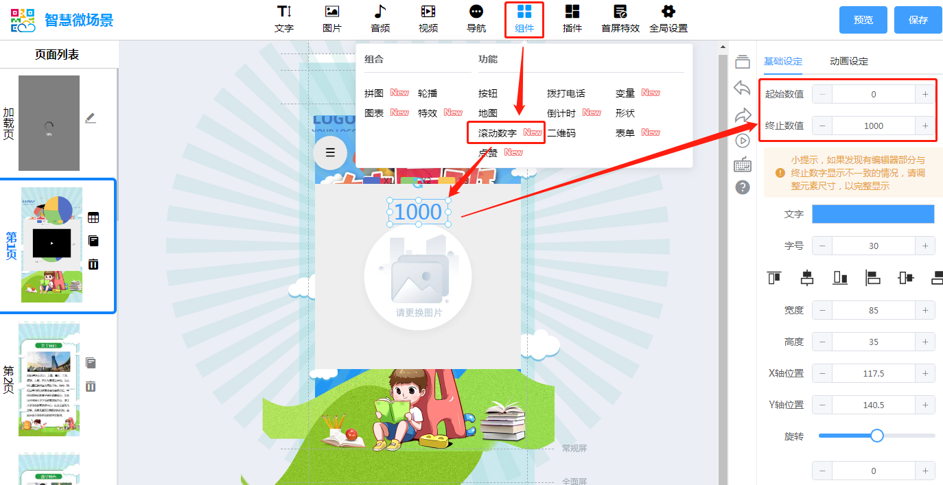 ?滾動數字組件,設置開始和終止數值,掃碼預覽時會從開始的數字滾動向最終終止的數字,主要作為數據增長的體現。