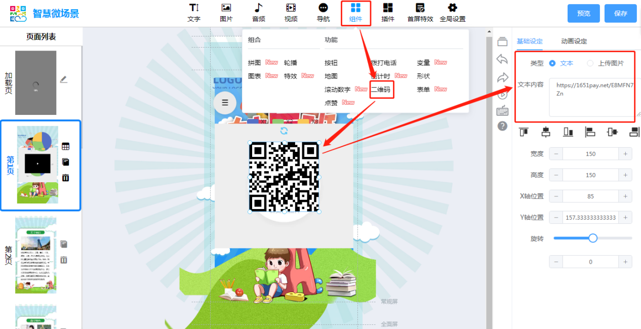 ?二維碼組件,可通過放入鏈接轉成二維碼的形式來植入二維碼,也可以直接將已經做好的二維碼下載成圖片并通過上傳圖片的形式上傳二維碼