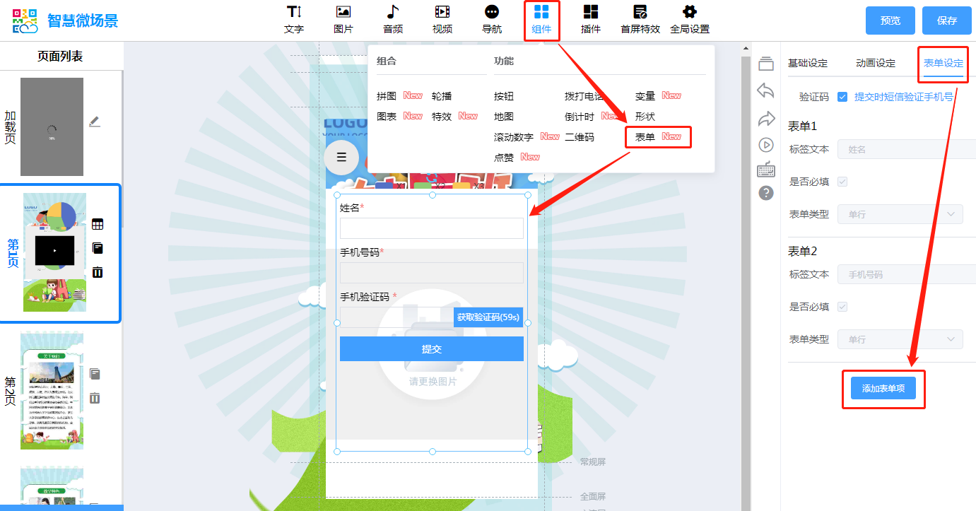 ?表單組件,這是微場景2.0自帶的可收集意向數據的表單,初始默認表單項是姓名和手機號,這兩項均為必填項并且無法刪除,如有其他數據的收集需求,可在表單設定里繼續‘添加表單項’
