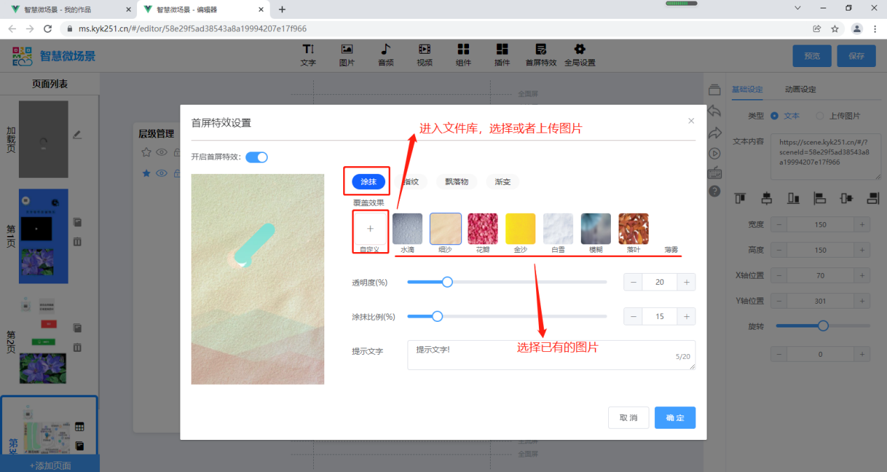 2.8首屏特效組件,點擊“開啟首屏特效”,目前有四種方式:涂抹、指紋、飄落物、漸變。