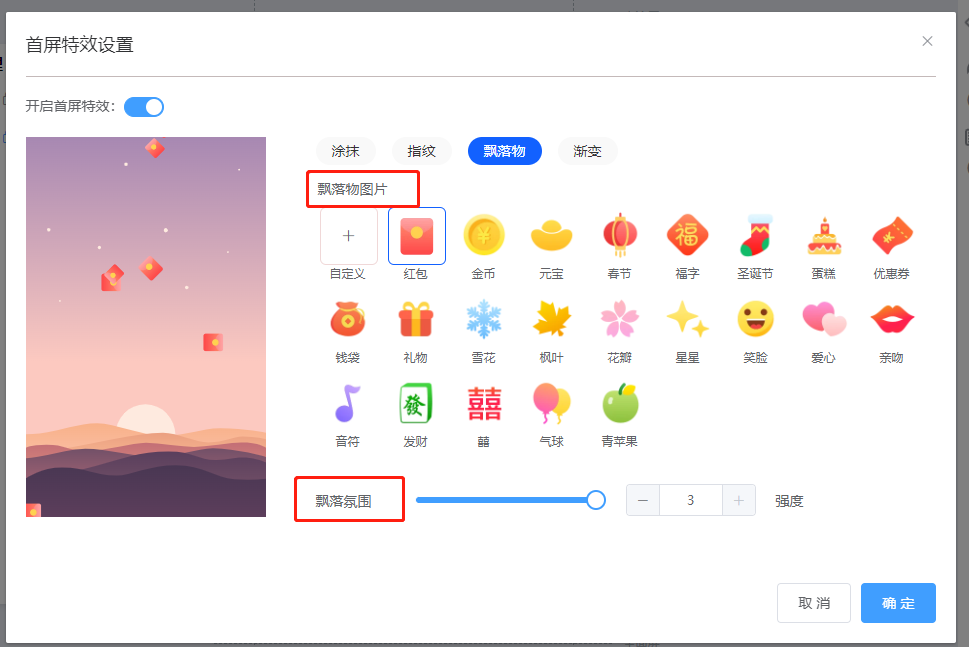 ③飄落物:飄落物可以選擇飄落物圖片,選擇飄落氛圍強度。