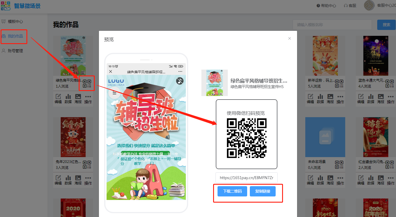 作品分享方式有兩種: 二維碼分享預覽、鏈接分享預覽。如下圖所示:
