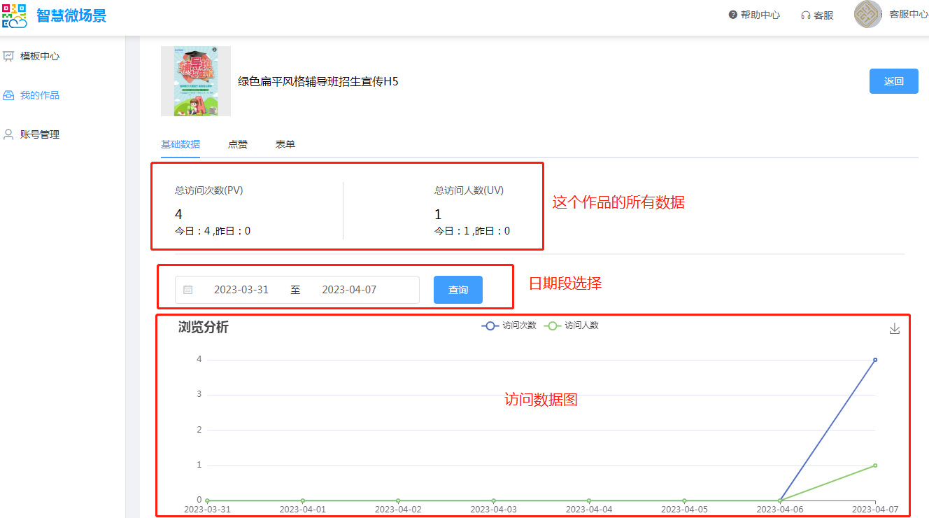 6、找到已創建的場景,點數據,可查看報表數據,可以查看總訪問數據量,也可以查看某一時間段的數據量。如下圖所示: