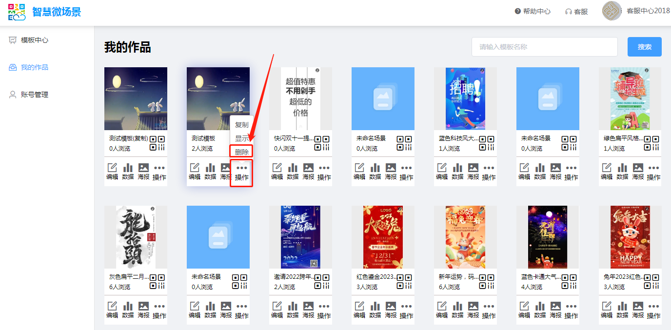 刪除作品:點擊我的作品-操作-刪除,可以刪除一個作品(建議謹慎操作,刪除后無法恢復)。如下圖所示: