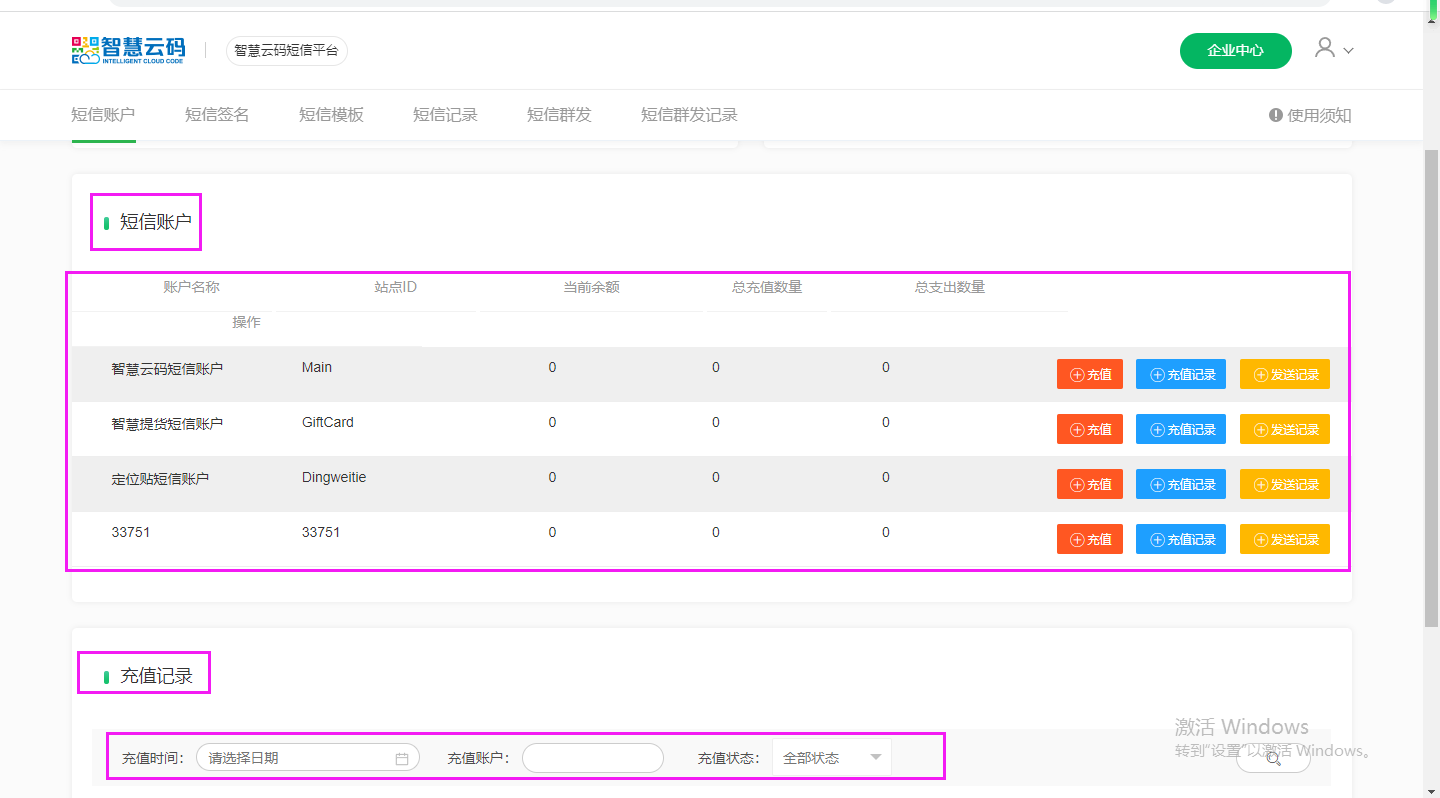 其次,不管哪個入口進來,點擊后都是直接進去以下界面,可對應充短信以及操作更多界面設置(含短信賬戶里的詳細數據內容:賬戶名稱、站點ID、當前余額、總充值數量、總支出數量發送和充值記錄等數據),如下圖所示: