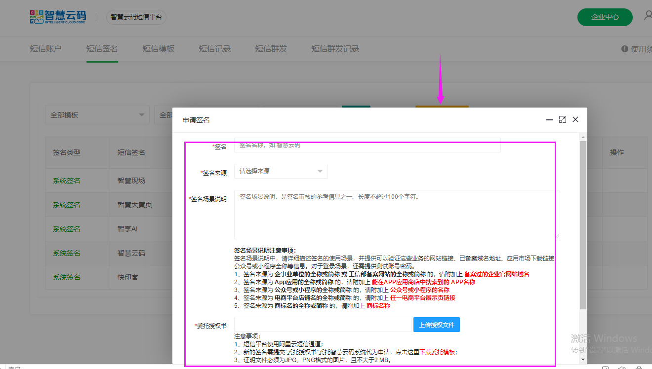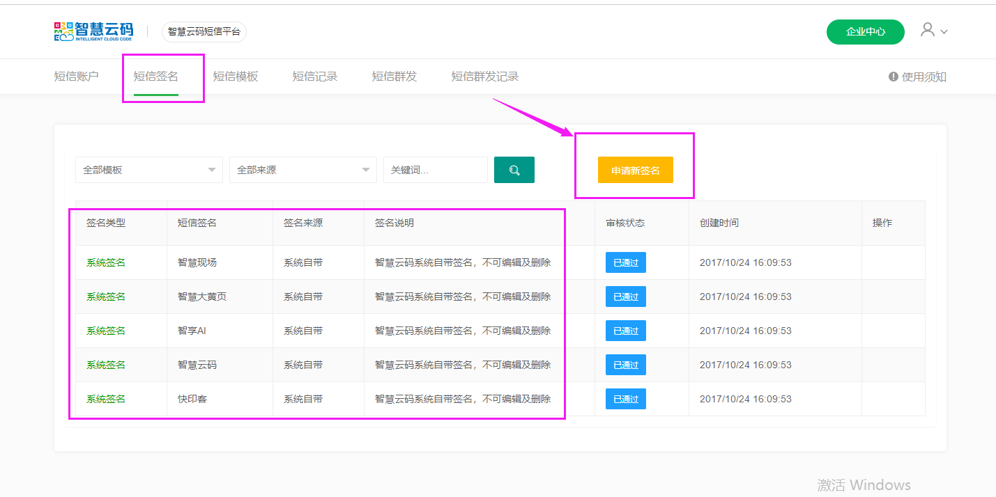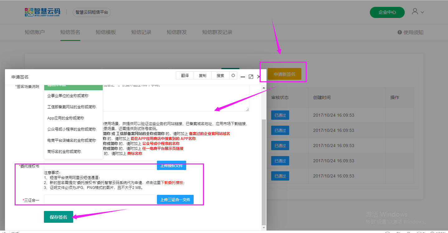 第三:關于短信簽名板塊,含智慧云碼針對部分系統對應自帶簽名,不可編輯及刪除以及可自定義申請新簽名,如實按照系統要求說明對應填寫上傳資料最后保存簽名即可,如下圖所示