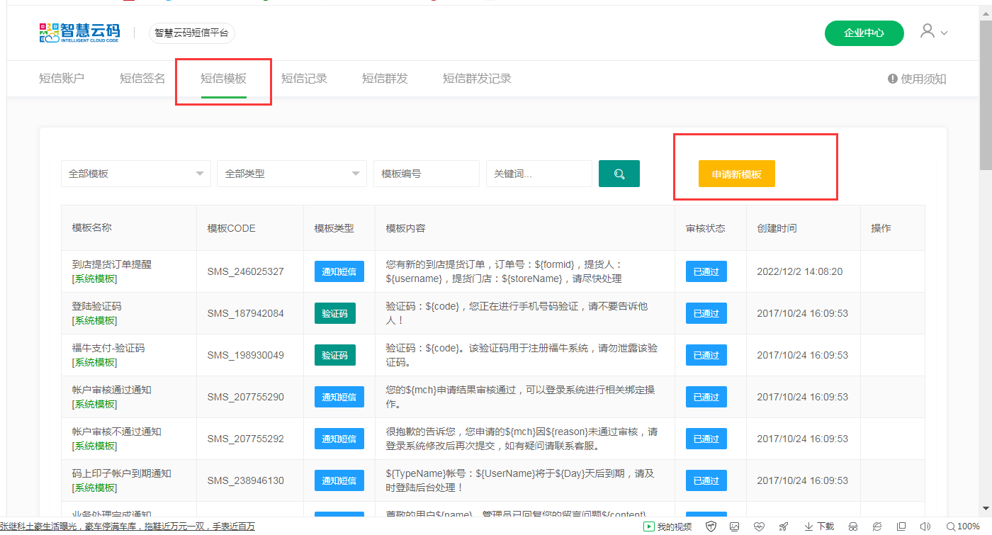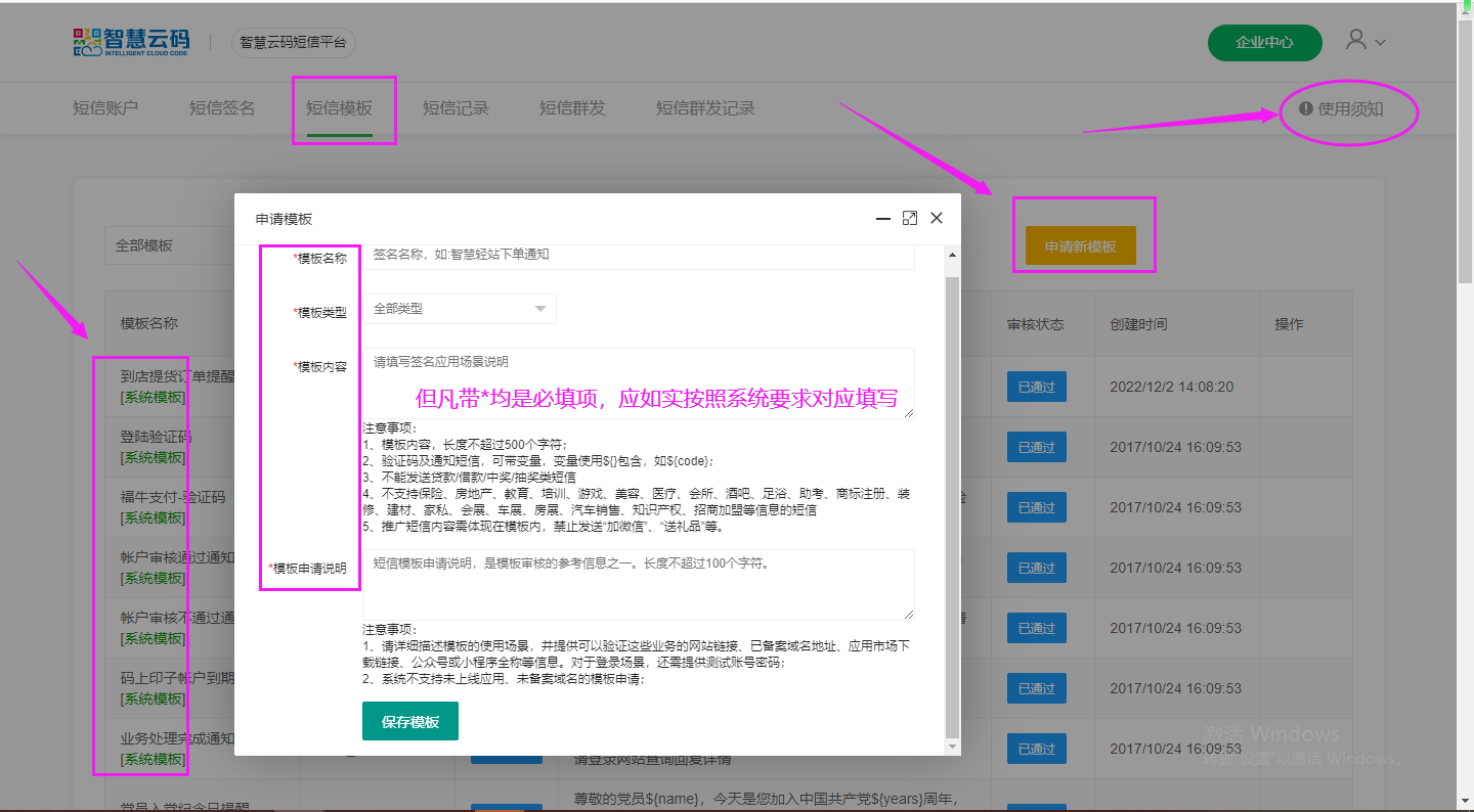 第四:關于短信模板,系統根據不同平臺功能板塊會有系統模板,您也可以自定義點擊申請新模板去對應填寫創建模板保存使用,如下圖所示:(右上角附有使用須知,具體說明請點擊查閱了解)