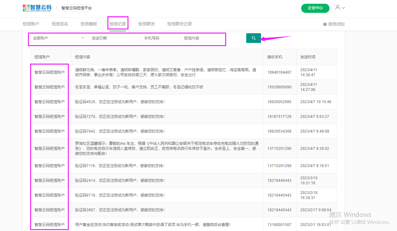 第五:關于短信記錄,點擊后可查看智慧云碼系統短信全部賬戶以及對應發送日期、短信內容、手機號碼等進行檢索查看對應記錄數據,如下圖所示: