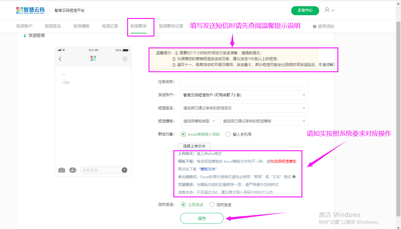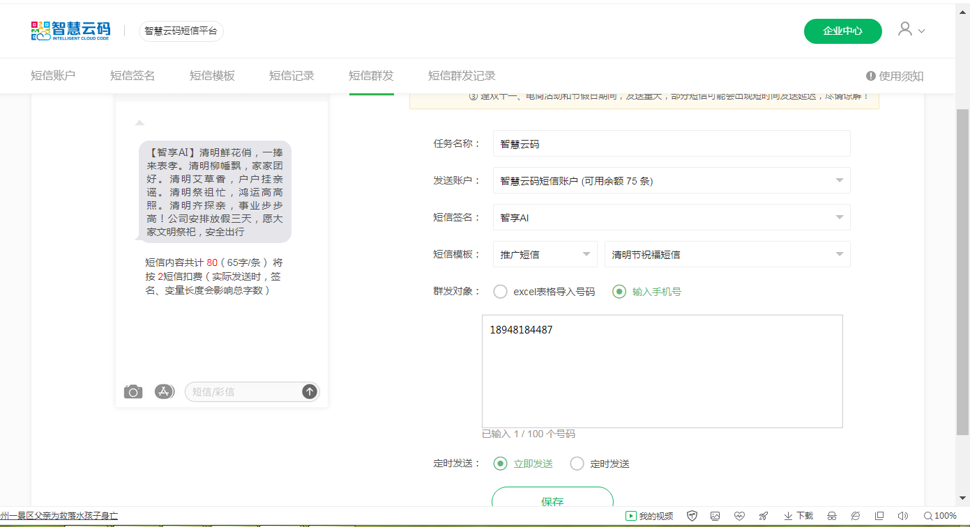 第六:關于短信群發,發送短信是需將以下任務名稱、發送賬戶、智慧云碼短信賬戶 (可用余額 0 條)、短信簽名、短信模板、群發對象、發送類型(分立即發送或定時發送)等信息按照要求對應填寫選,最后保存即可,如下圖所示: