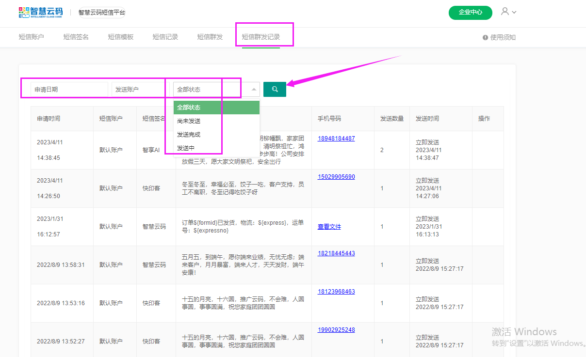 第六:關于短信群發記錄,可對應從該位置根據申請日期、發送賬戶、全部狀態(含尚未發送、發送完成、發送中)檢索出來對應記錄數據查看,如下圖所示: