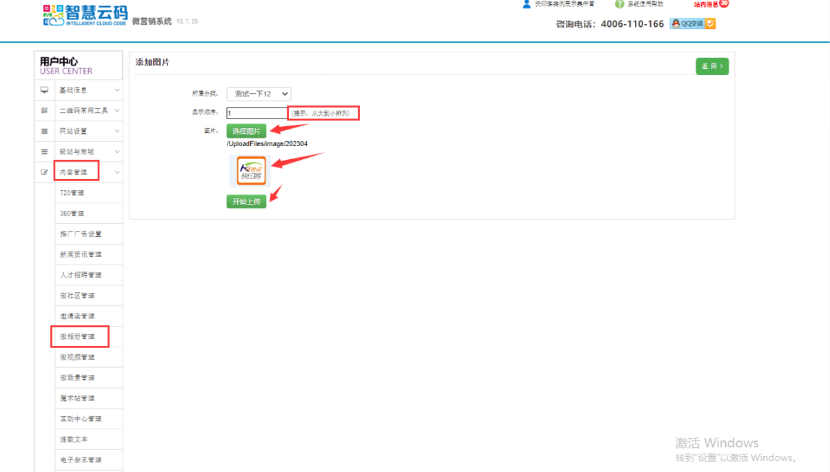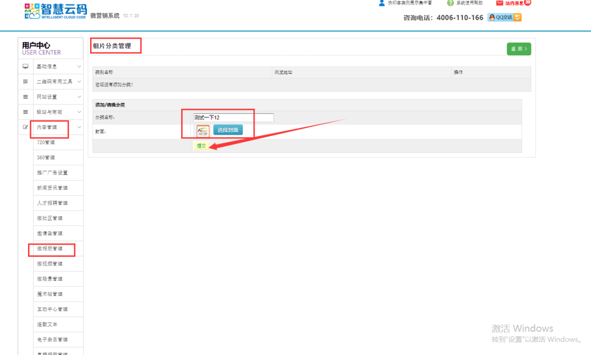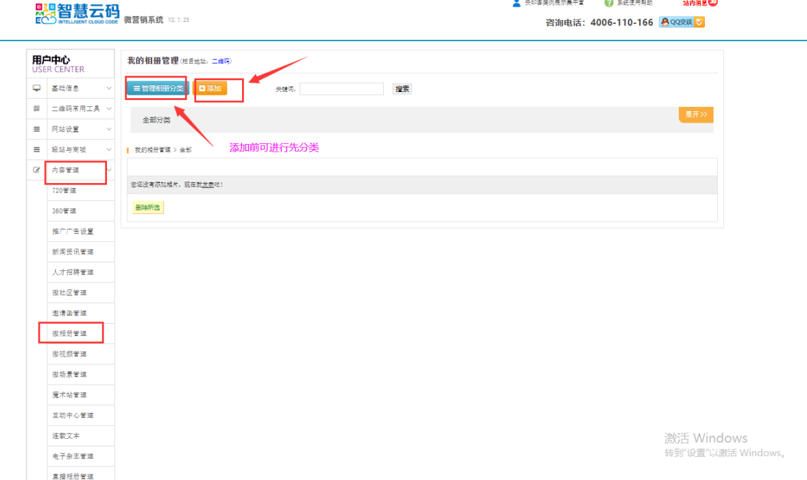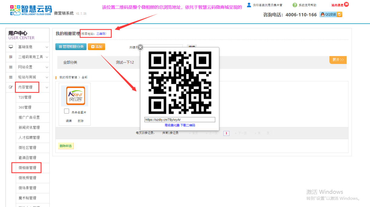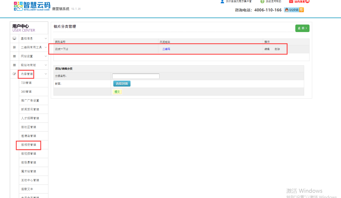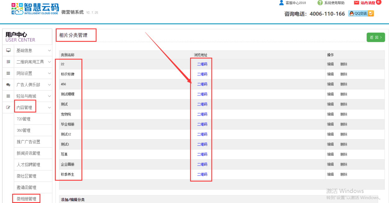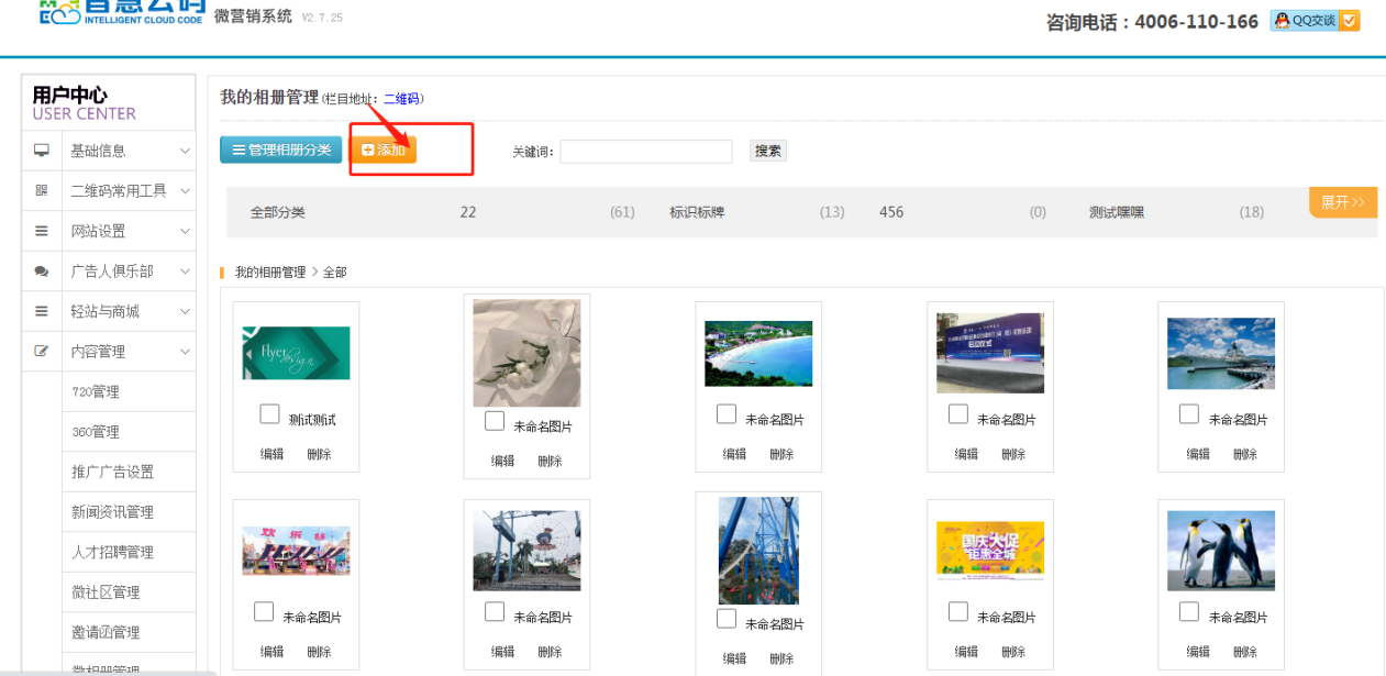 4、添加成功上傳圖片后返回微相冊(cè)管理,欄目地址點(diǎn)開(kāi)的藍(lán)色二維碼則是該整個(gè)微相冊(cè)的總瀏覽地址;如果分類較多,亦可點(diǎn)開(kāi)相冊(cè)分類下圖展開(kāi)按鈕便可快速找到對(duì)應(yīng)分類以及所上傳圖片的呈現(xiàn)界面!如下圖所示:
