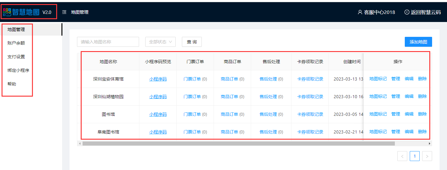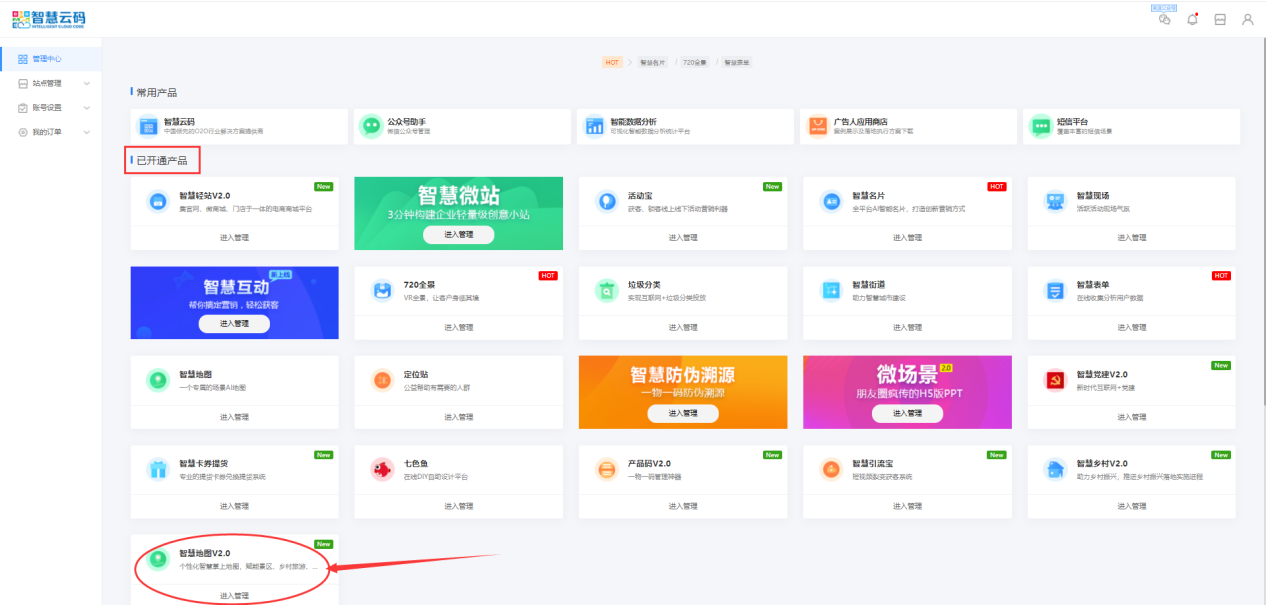 1、首先登陸智慧云碼系統,找到已開通產品,點擊智慧地圖V2.0進入管理,如下圖所示: