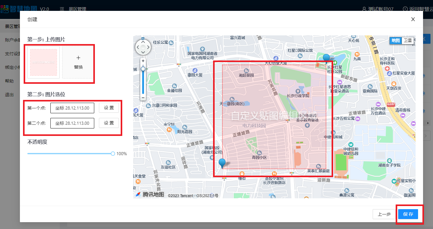 第三步:上傳圖片,自定義貼圖編輯區域并通過地圖選點來確定所選貼圖的圖片選位,點擊【保存】按鈕。如下圖所示: