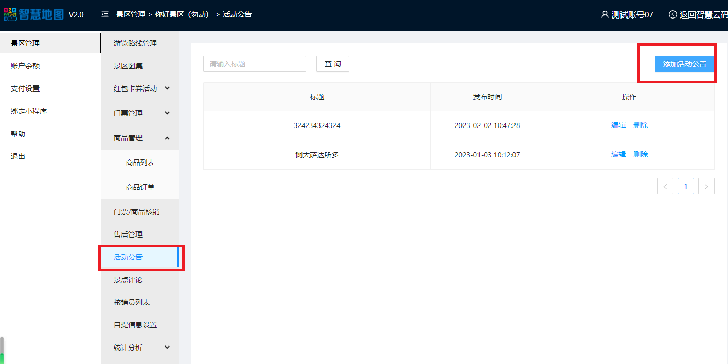 在景區管理中的活動公告,點擊添加活動公告,輸入公告內容即可。公告用于在手機端首頁活動公告中展示。如下圖所示: