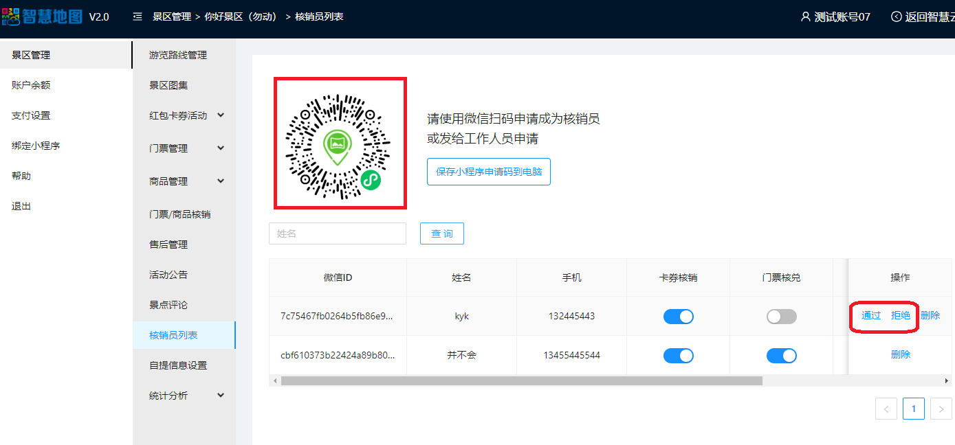 第一步:在核銷員列表頁,(可下載保存)分享給用戶掃碼。用戶在手機端提交核銷員申請。